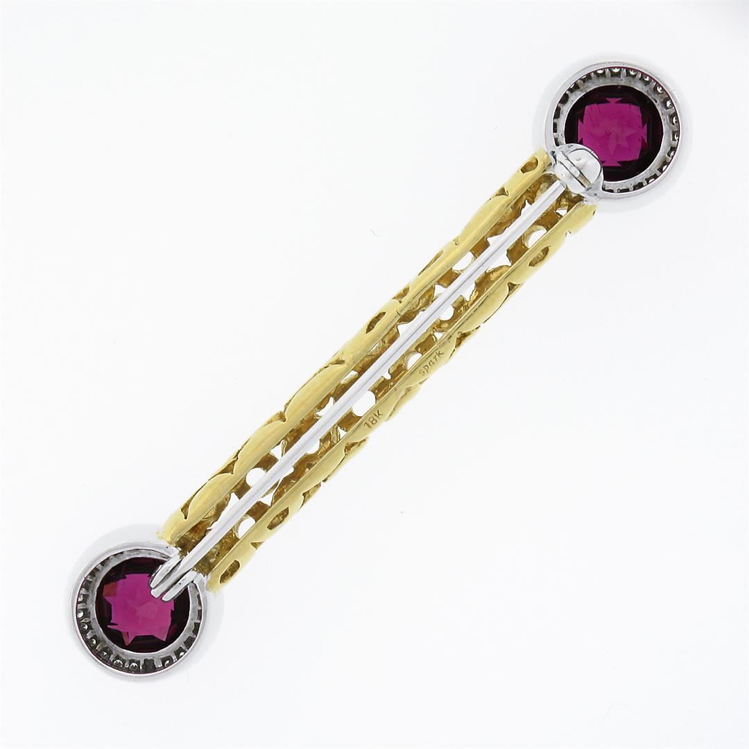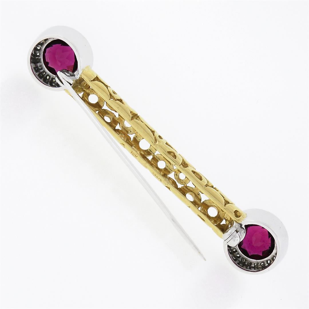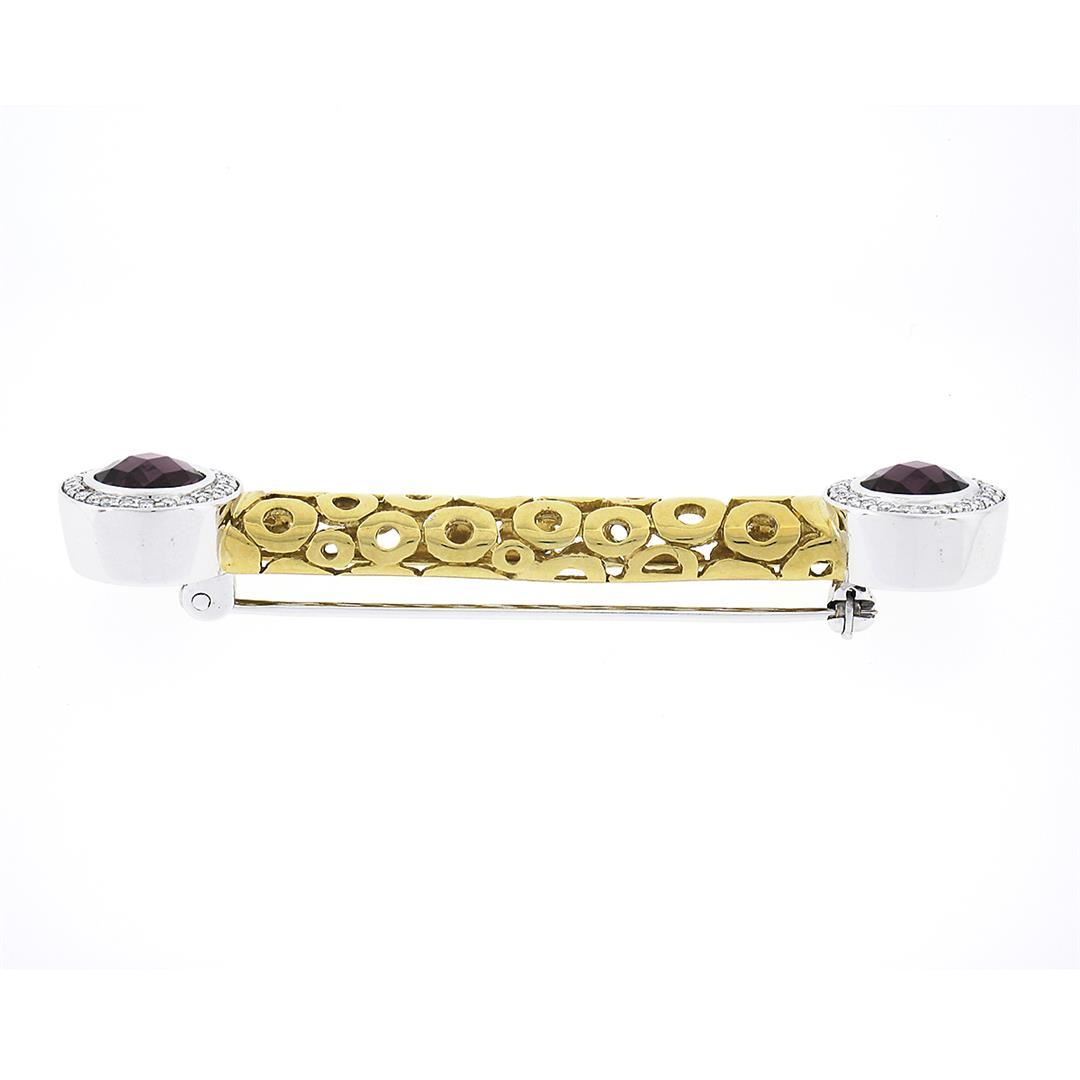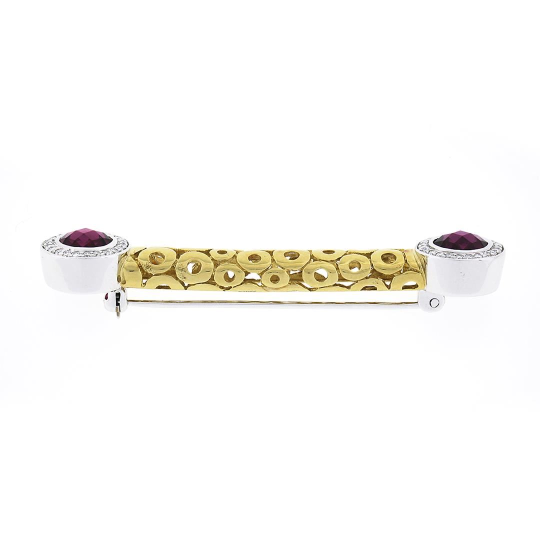 A solid 18k yellow and white gold bar pin brooch, with 2 round checkerboard natural tourmaline (3.50ctw), and 48 round brilliant cut natural diamonds (F/G - VS1/VS2 ; 0.50ctw). Measures 61.10x11.80mm and weighs a total of 13.11 grams.