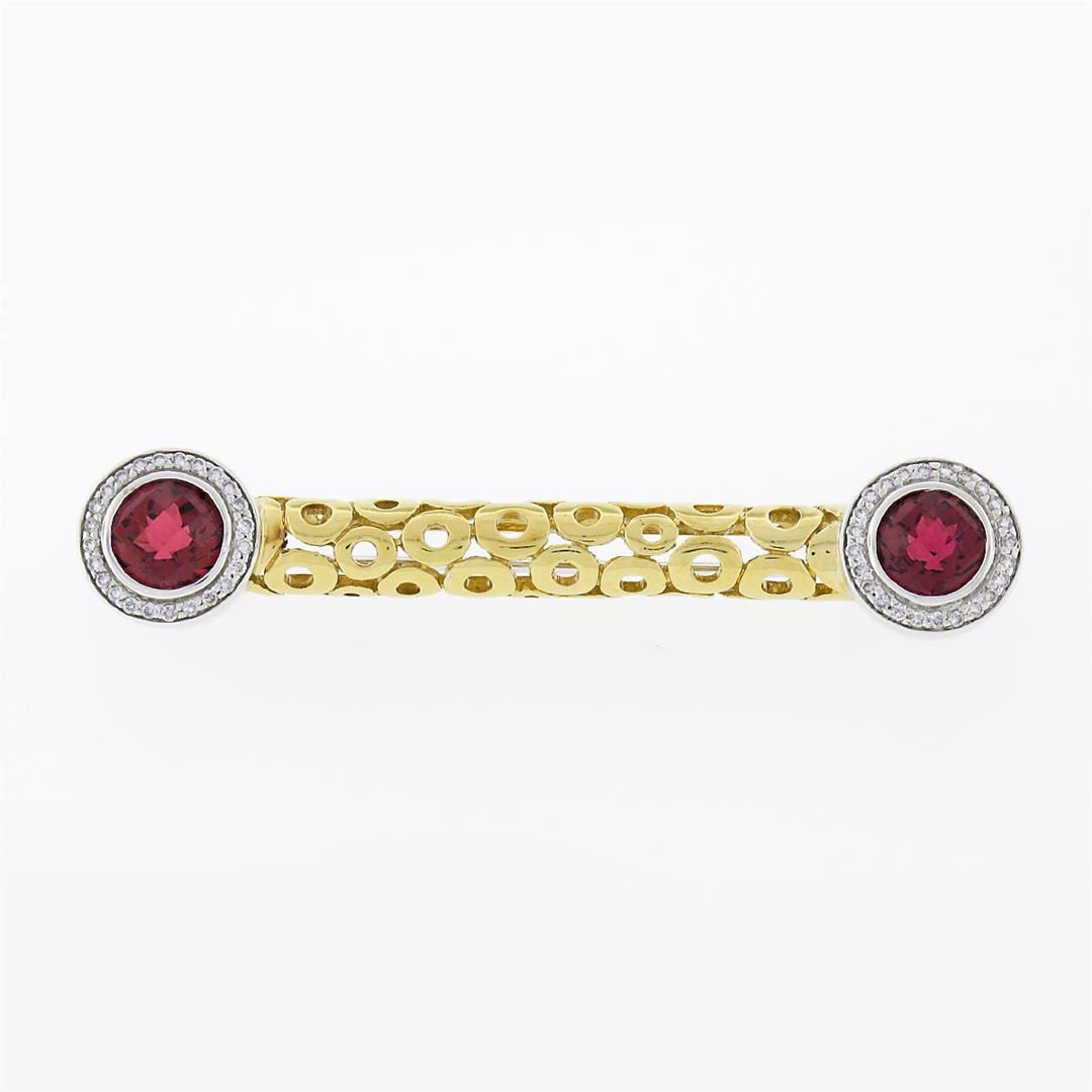 A solid 18k yellow and white gold bar pin brooch, with 2 round checkerboard natural tourmaline (3.50ctw), and 48 round brilliant cut natural diamonds (F/G - VS1/VS2 ; 0.50ctw). Measures 61.10x11.80mm and weighs a total of 13.11 grams.