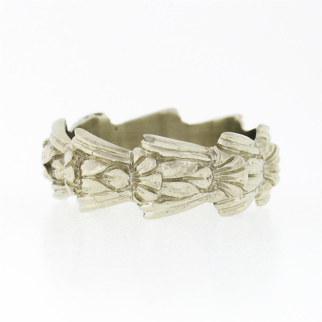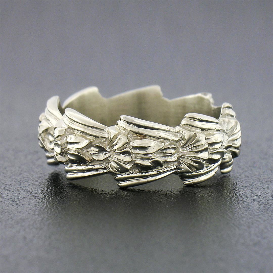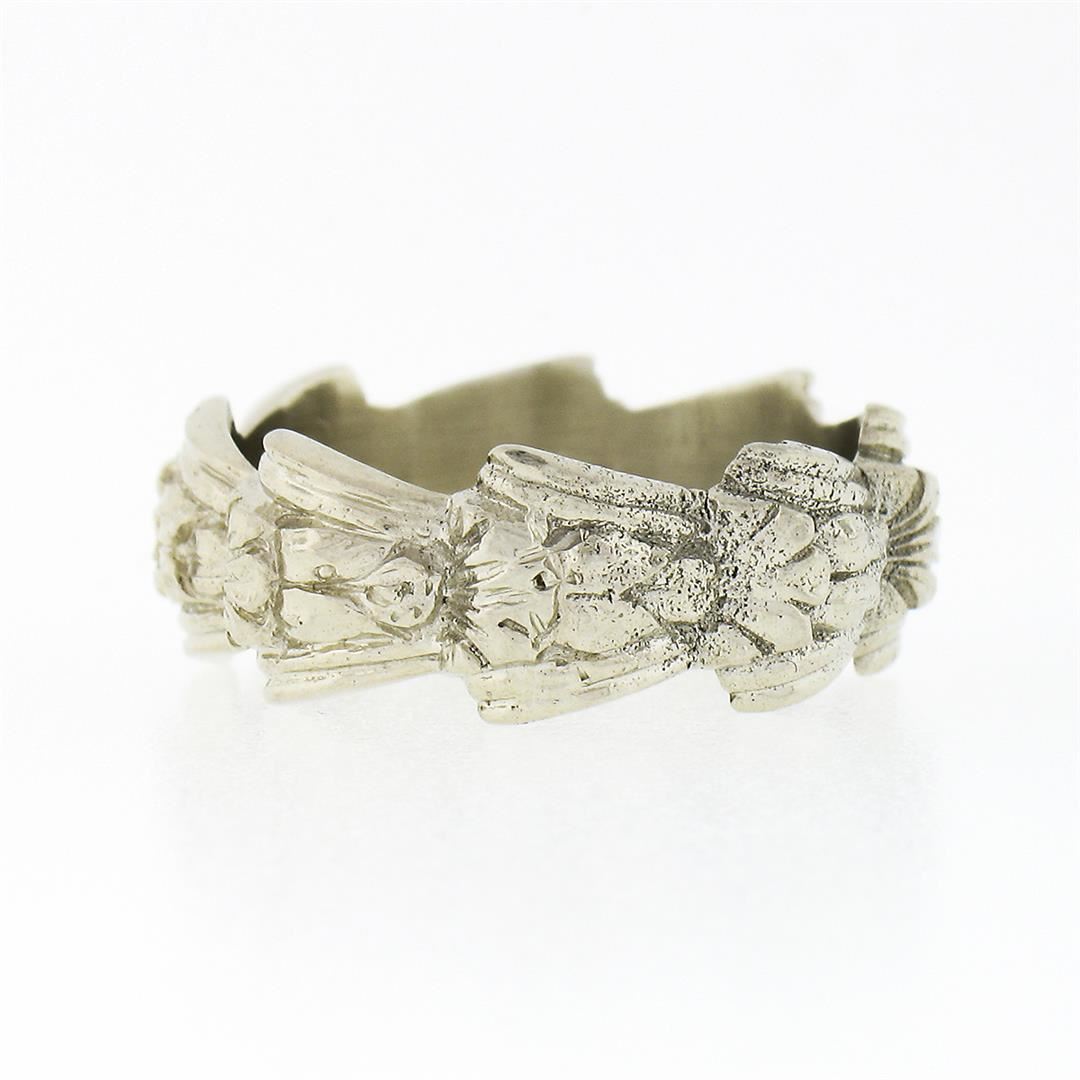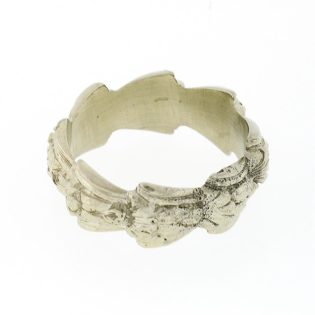 A vintage solid 14k white gold wavy band ring. The ring is size 5.0, weighs a total of 4.61 grams, and measures 7.0mm wide.