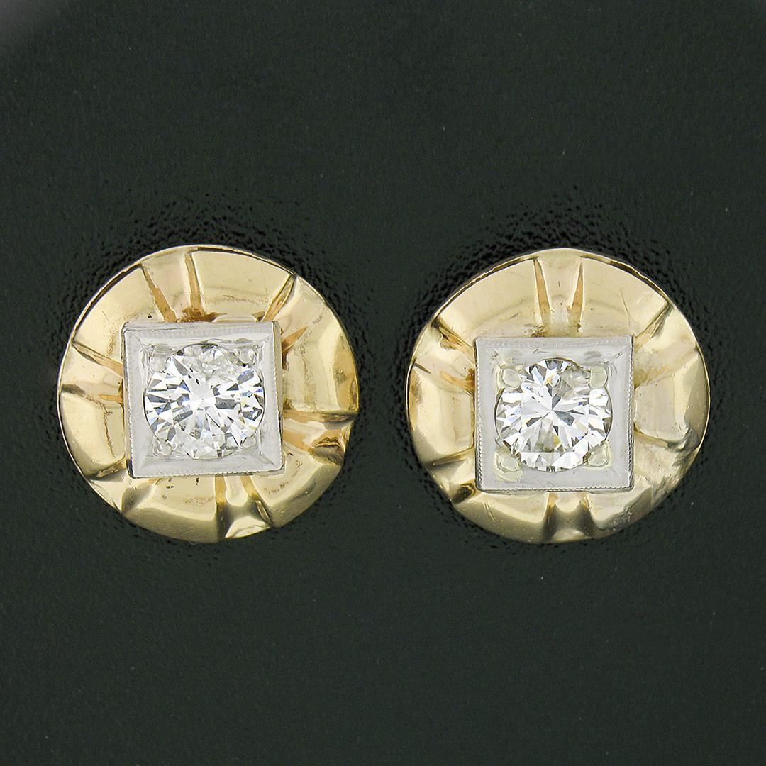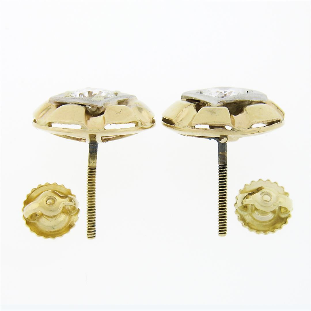 A vintage solid 14k yellow & white gold stud earrings, with 2 old transitional cut natural diamonds (G/H - I1 ; 0.94ctw). The earrings measure approximately 12.85mm in diameter and weigh a total of 3.5 grams.