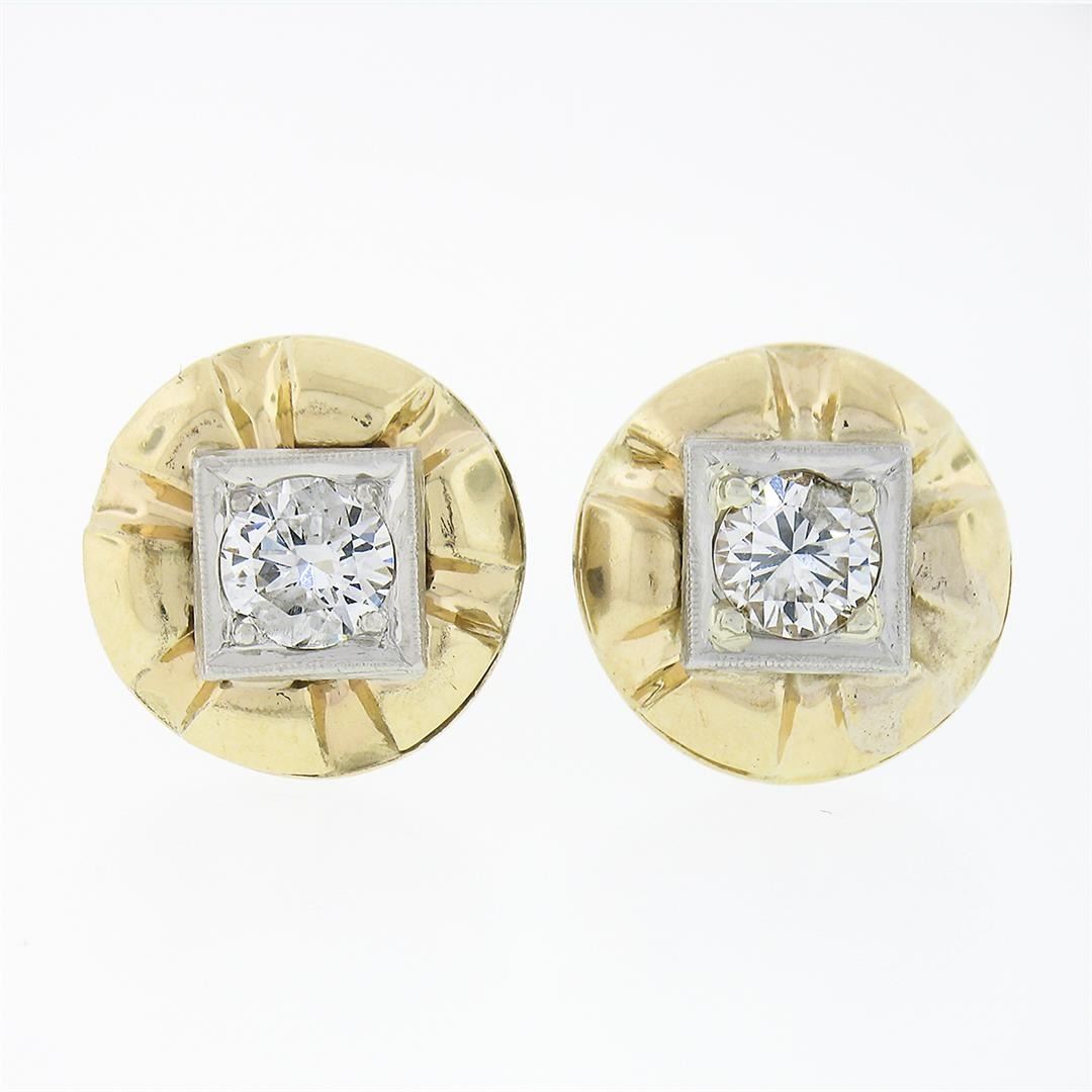 A vintage solid 14k yellow & white gold stud earrings, with 2 old transitional cut natural diamonds (G/H - I1 ; 0.94ctw). The earrings measure approximately 12.85mm in diameter and weigh a total of 3.5 grams.