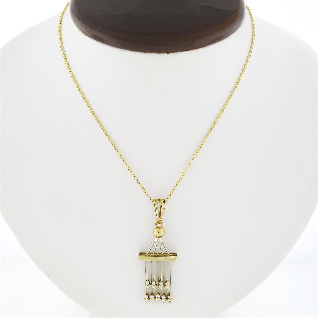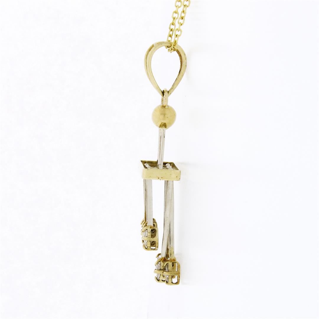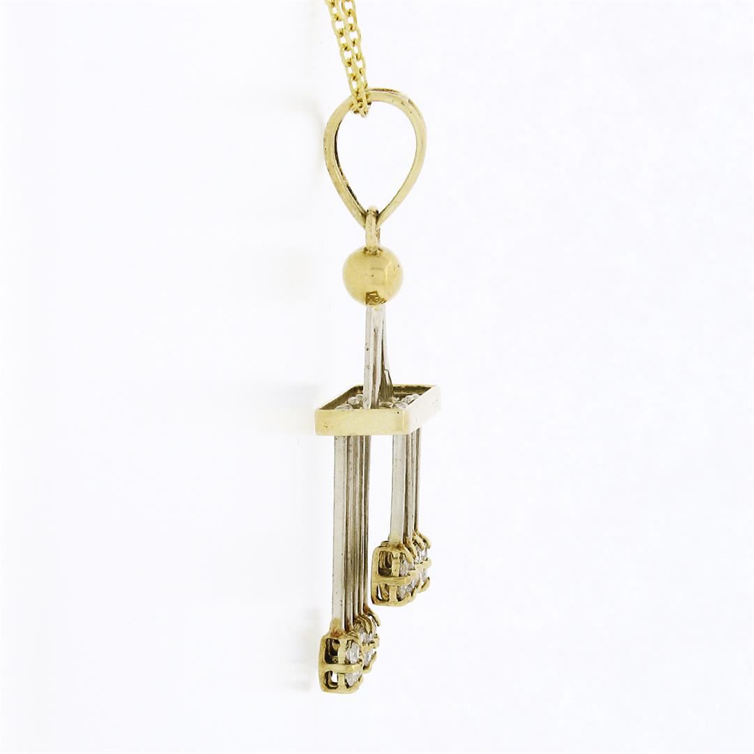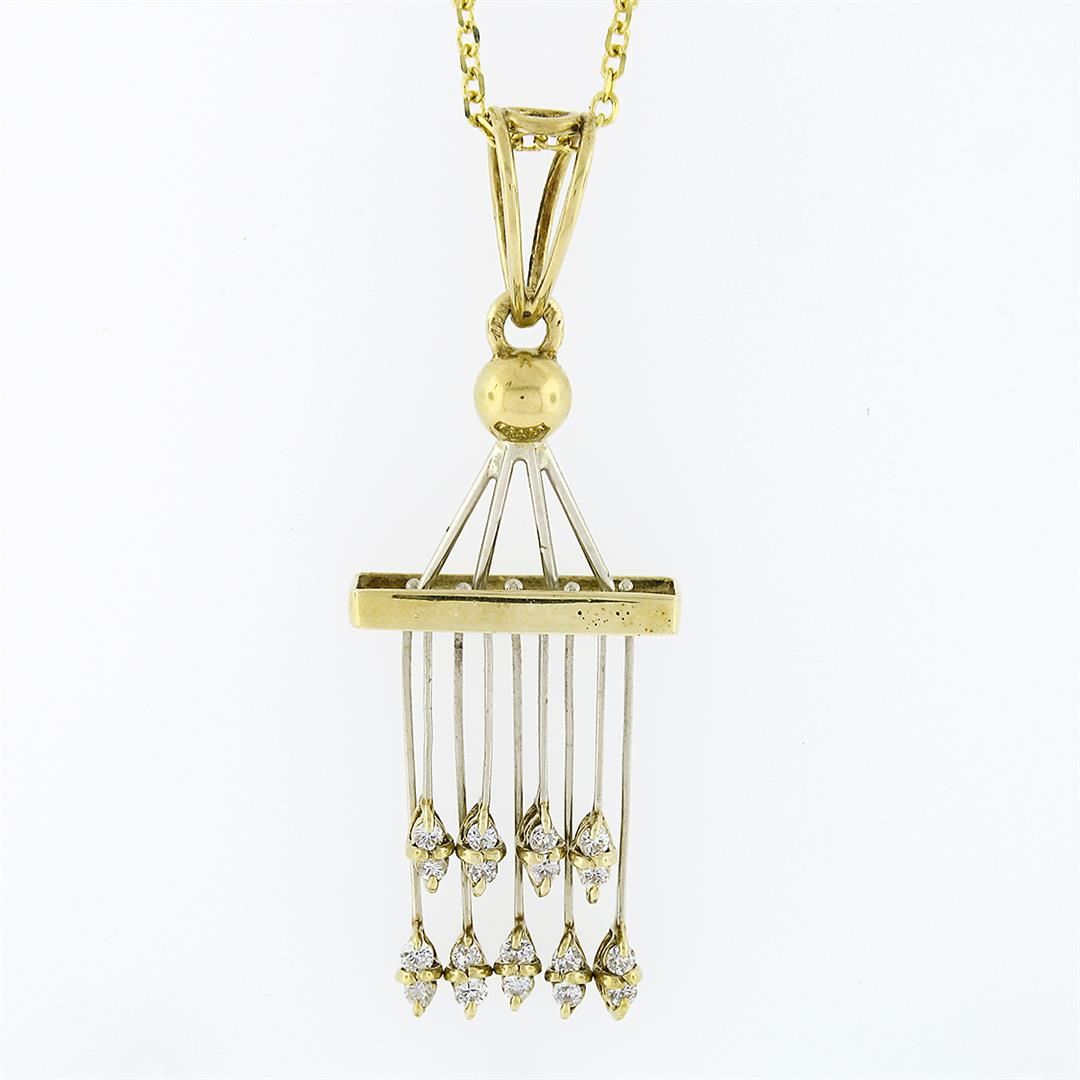 A vintage solid 14k yellow & white gold tassel dangle pendant necklace, with 18 round brilliant cut natural diamonds (H/I - VS2/SI1 ; 0.36ctw). 18 inch cable link chain, 7.06 grams total weight, pendant measures 48.45x17.35mm.