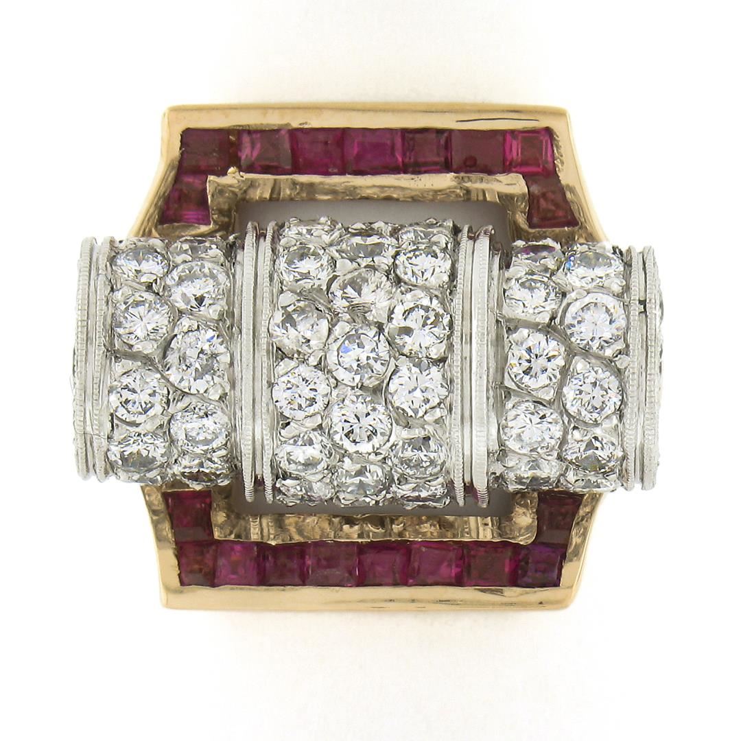 A vintage solid 14k yellow gold & platinum insert ring set, with 75 old trsansitional cut natural diamonds (G/I - VS2/I1 ; 2.15ctw), and 20 square step cut natural rubies (0.60ctw). The ring is size 6.5, weighs a total of 8.91 grams, and measures 17mm wide.