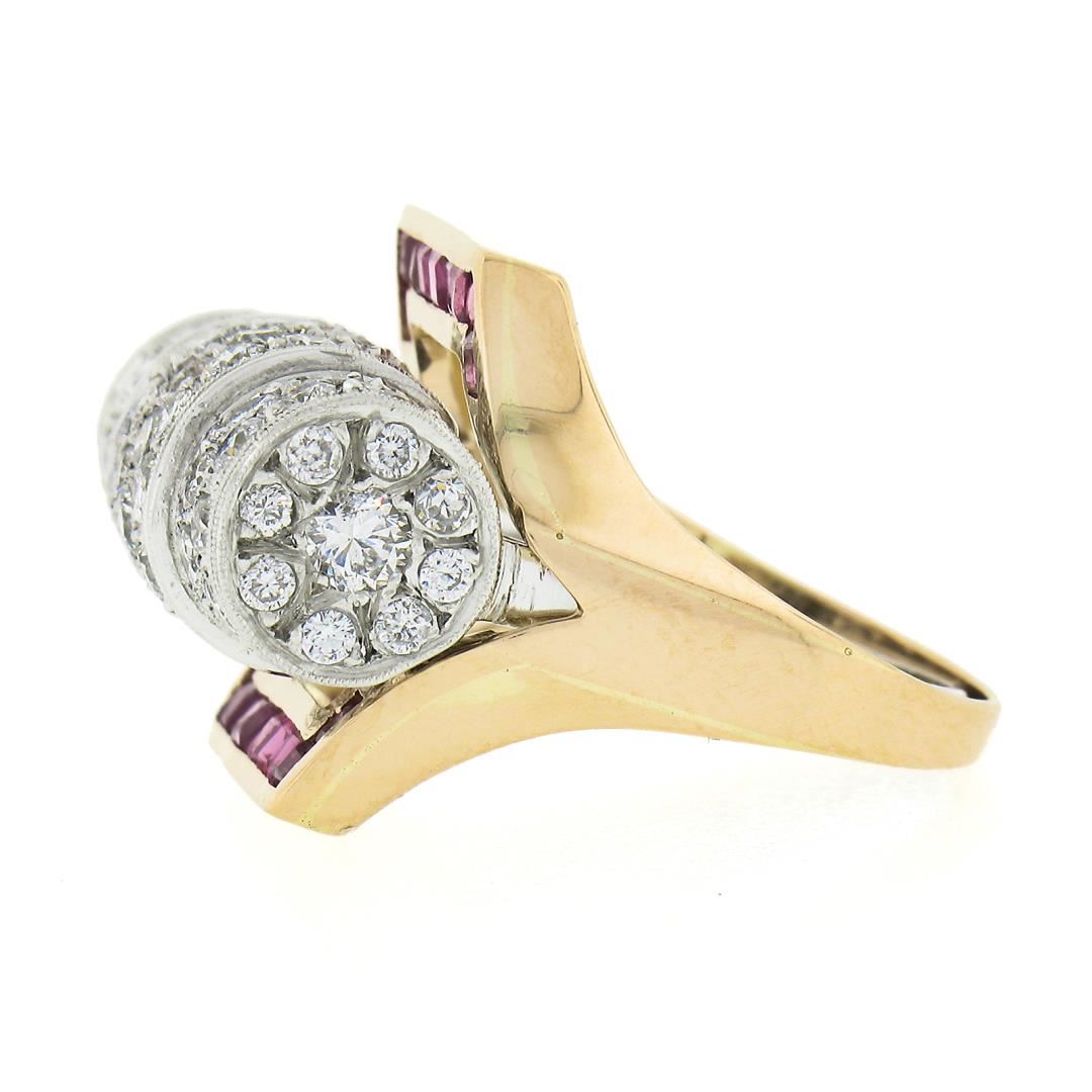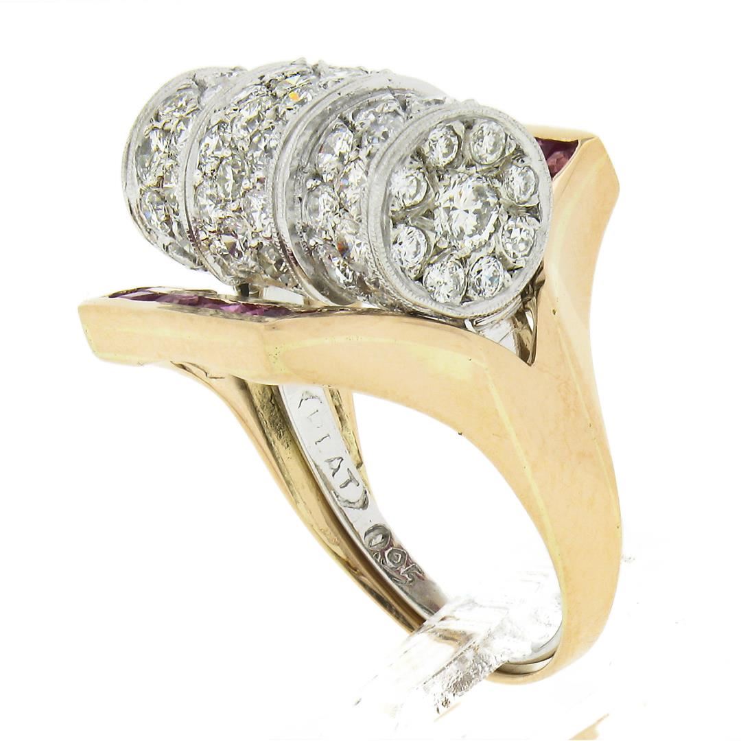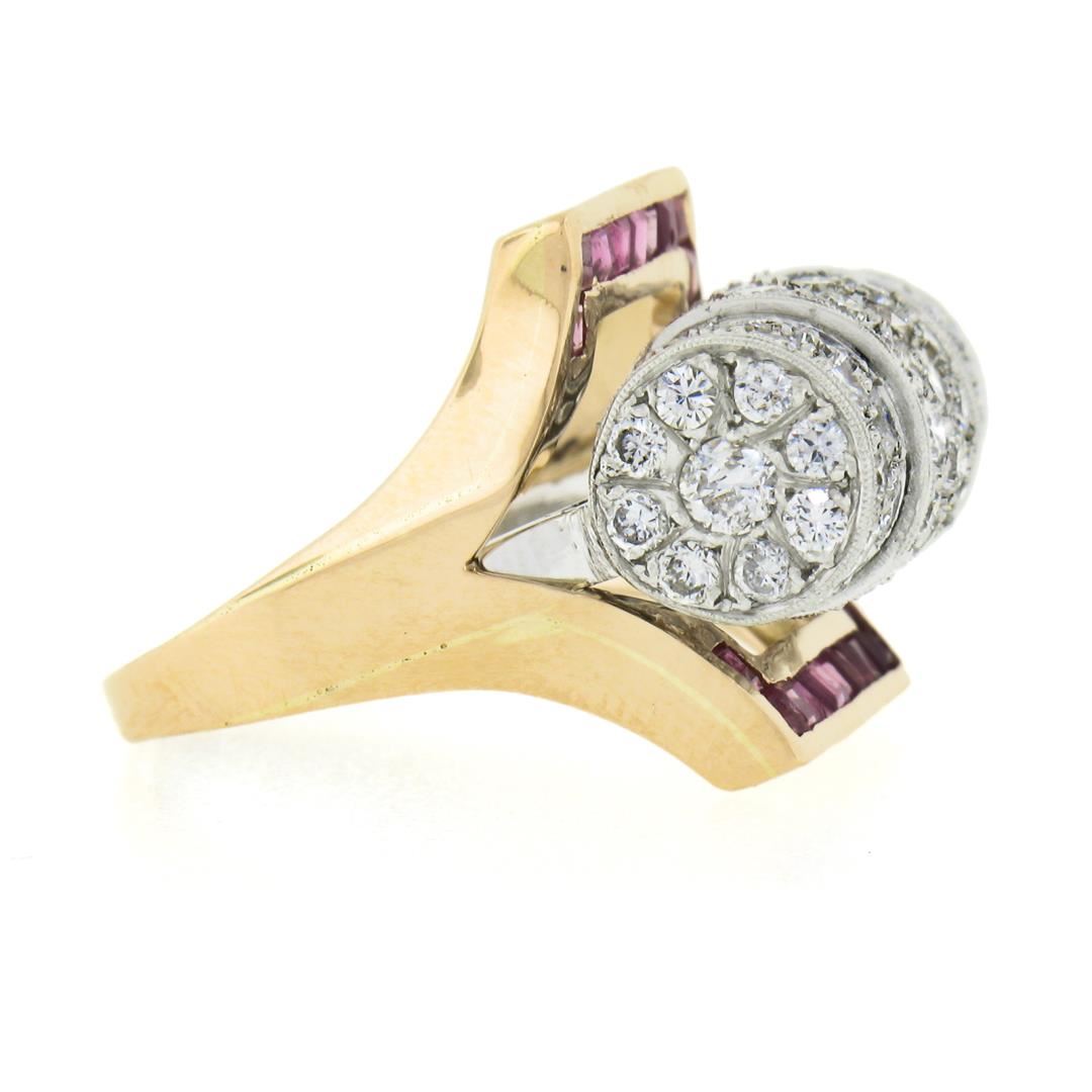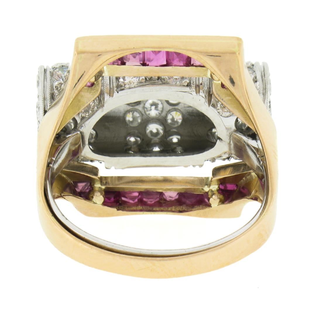 A vintage solid 14k yellow gold & platinum insert ring set, with 75 old trsansitional cut natural diamonds (G/I - VS2/I1 ; 2.15ctw), and 20 square step cut natural rubies (0.60ctw). The ring is size 6.5, weighs a total of 8.91 grams, and measures 17mm wide.