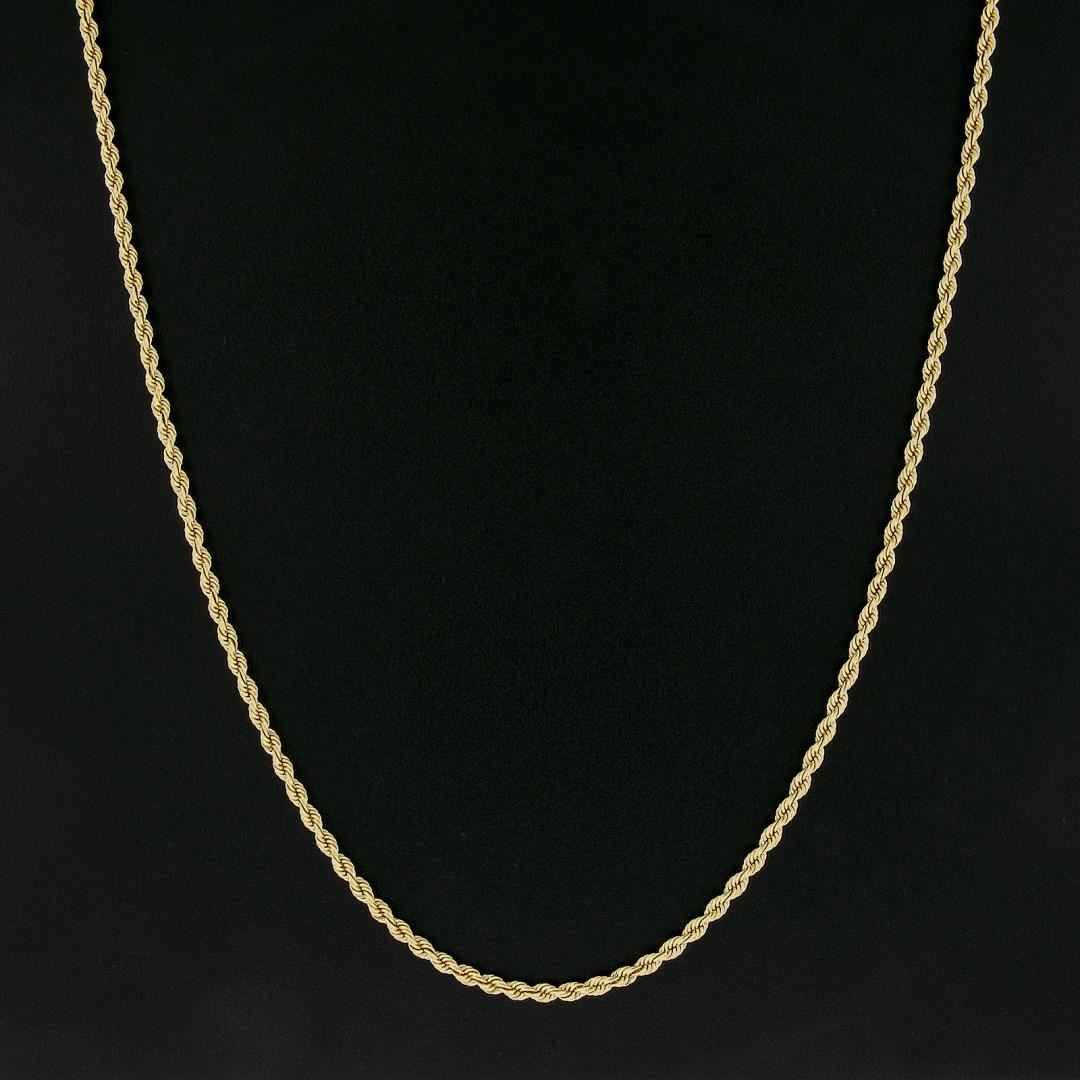 A solid 14k yellow gold rope link chain necklace. It weighs a total of 25.47 grams, measures 3.2mm wide, and measures 30 inches in length.