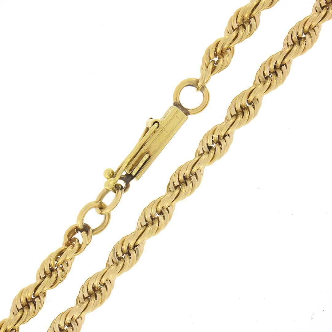 A solid 14k yellow gold rope link chain necklace. It weighs a total of 25.47 grams, measures 3.2mm wide, and measures 30 inches in length.