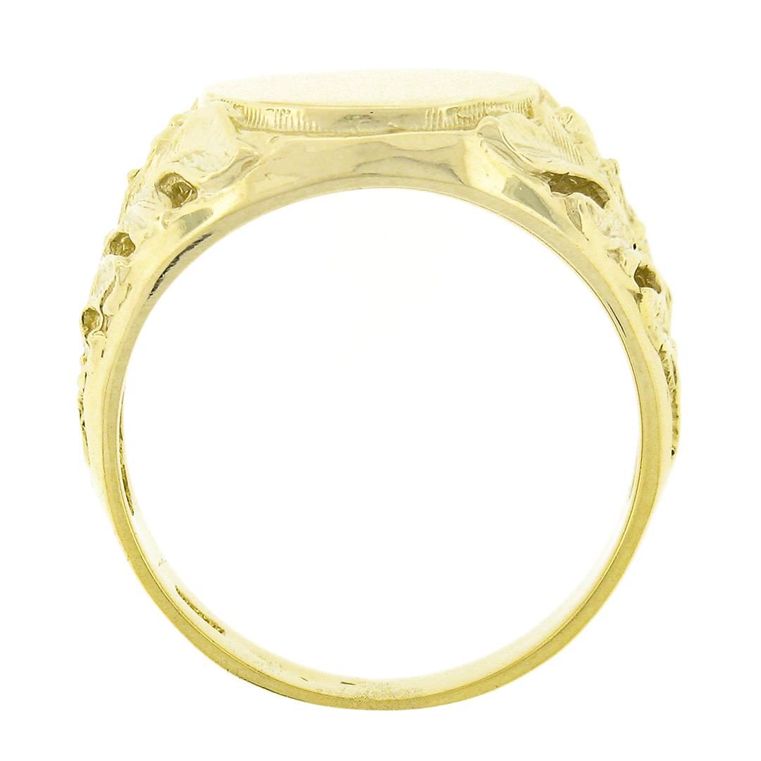 A solid 14k yellow gold signet ring. The ring is size 10, weighs a total of 7.78 grams, and measures 15.40mm wide.