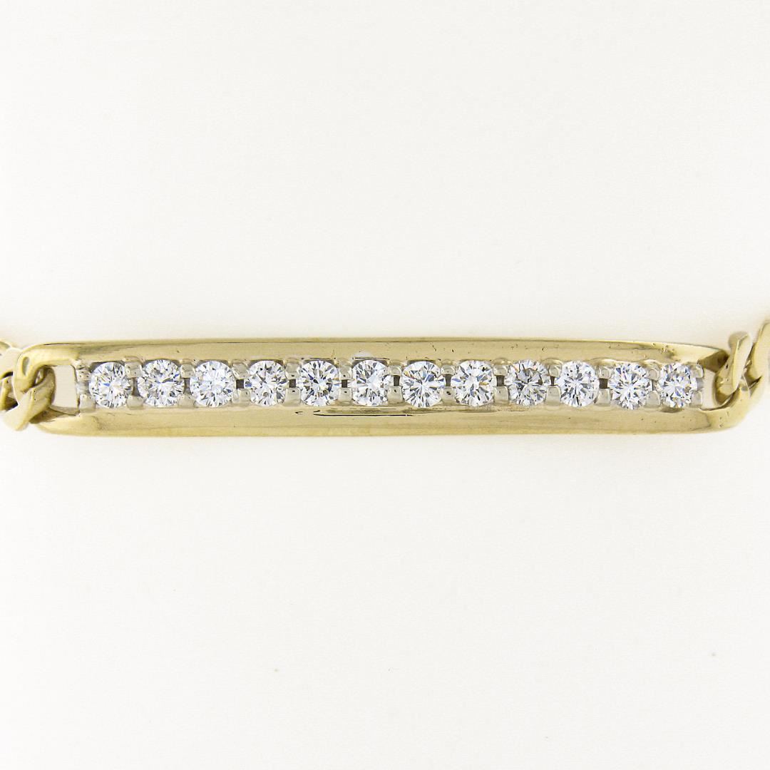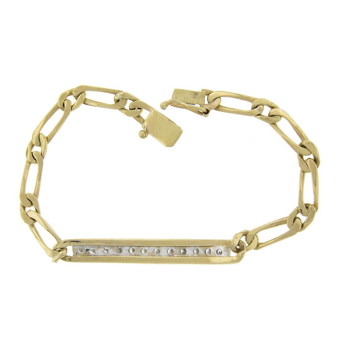 A solid 14k yellow gold id bracelet. with 12 round cut natural diamonds (F/G - VS1/VS2 ; 0.85ctw). It weighs a total of 10.53 grams, measures 5.6mm wide, and measures 6.75 inches in length.