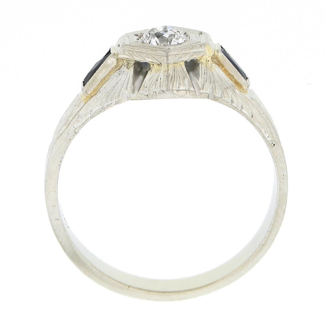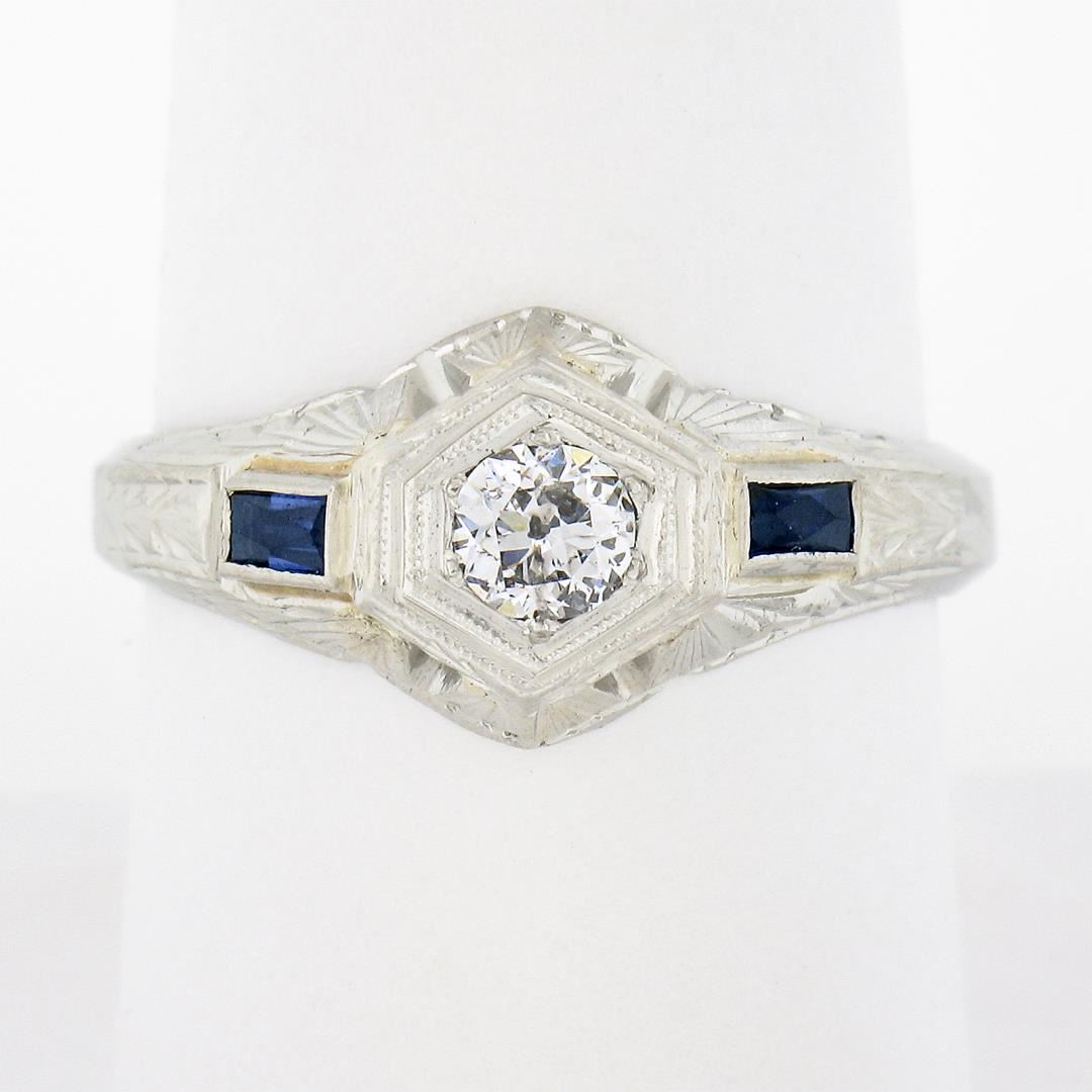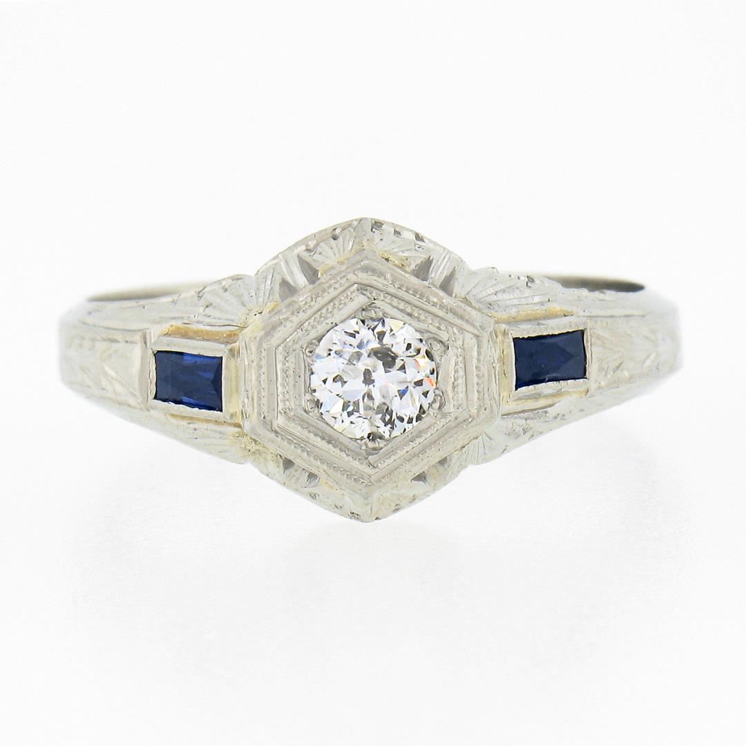 An antique solid 18k white gold ring, with 1 old European cut natural diamond (H - I1 ; 0.28ct), and 2 French baguette cut natural sapphires (0.24ctw). The ring is size 9.0, weighs a total of 5.49 grams, and measures 10.15mm wide.