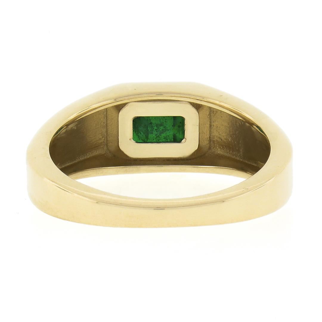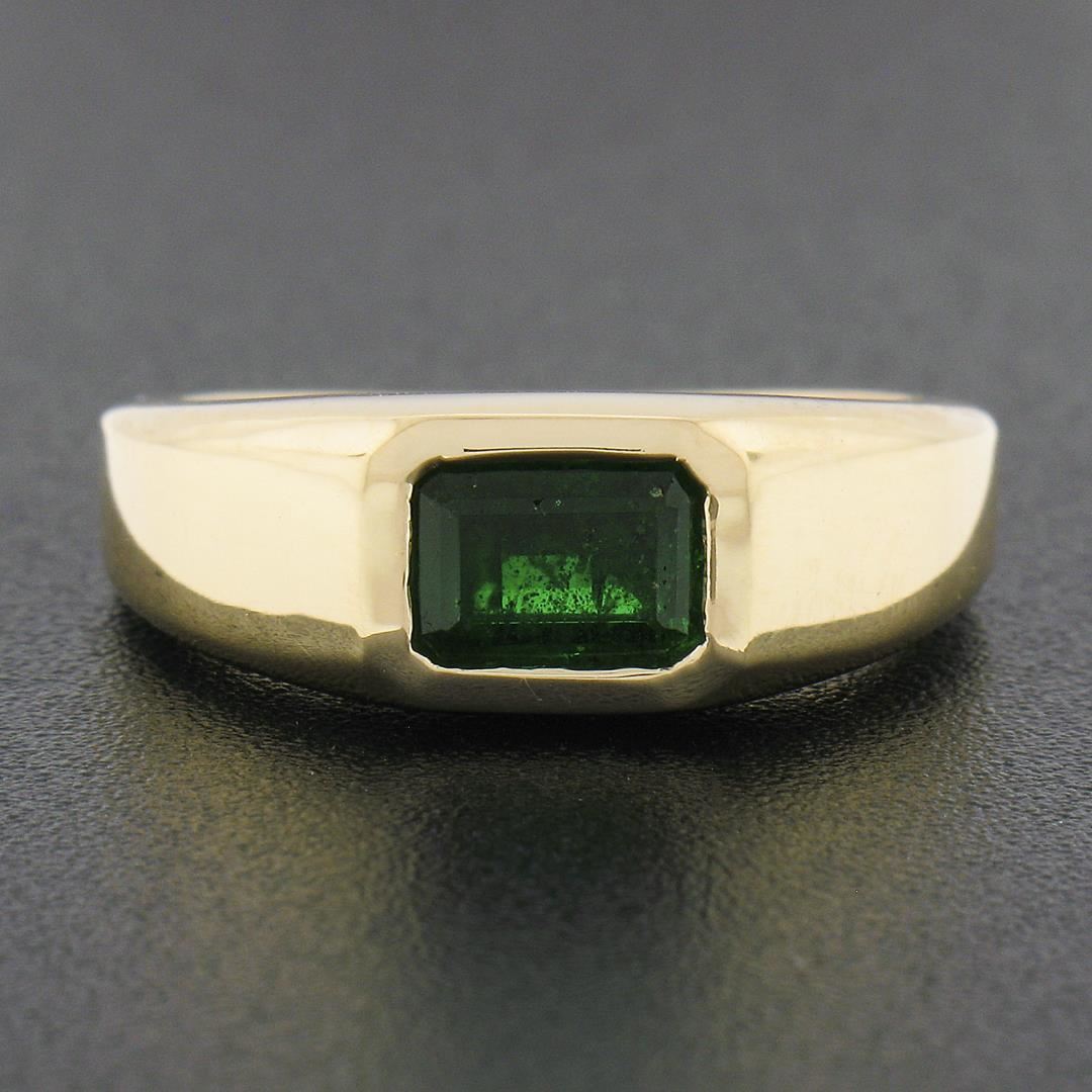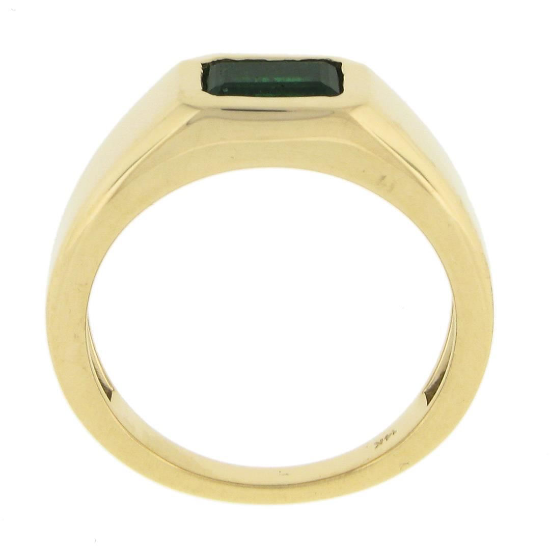 A new solid 14k yellow gold ring, with 1 elongated emerald cut natural emerald (0.64ct). The ring is size 6.5, weighs a total of 4.39 grams, and measures 7.1mm wide.