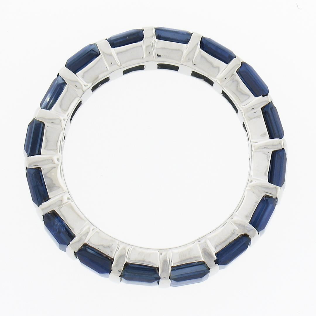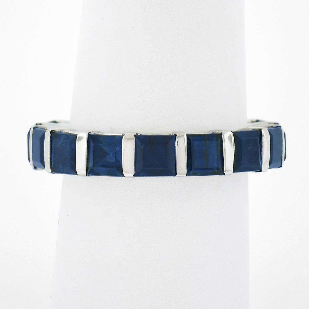 A solid platinum eternity band ring, featuring 16 square step cut natural sapphires (5.61ctw). The ring is size 7.0, weighs a total of 8.76 grams, and measures 4.20mm wide.