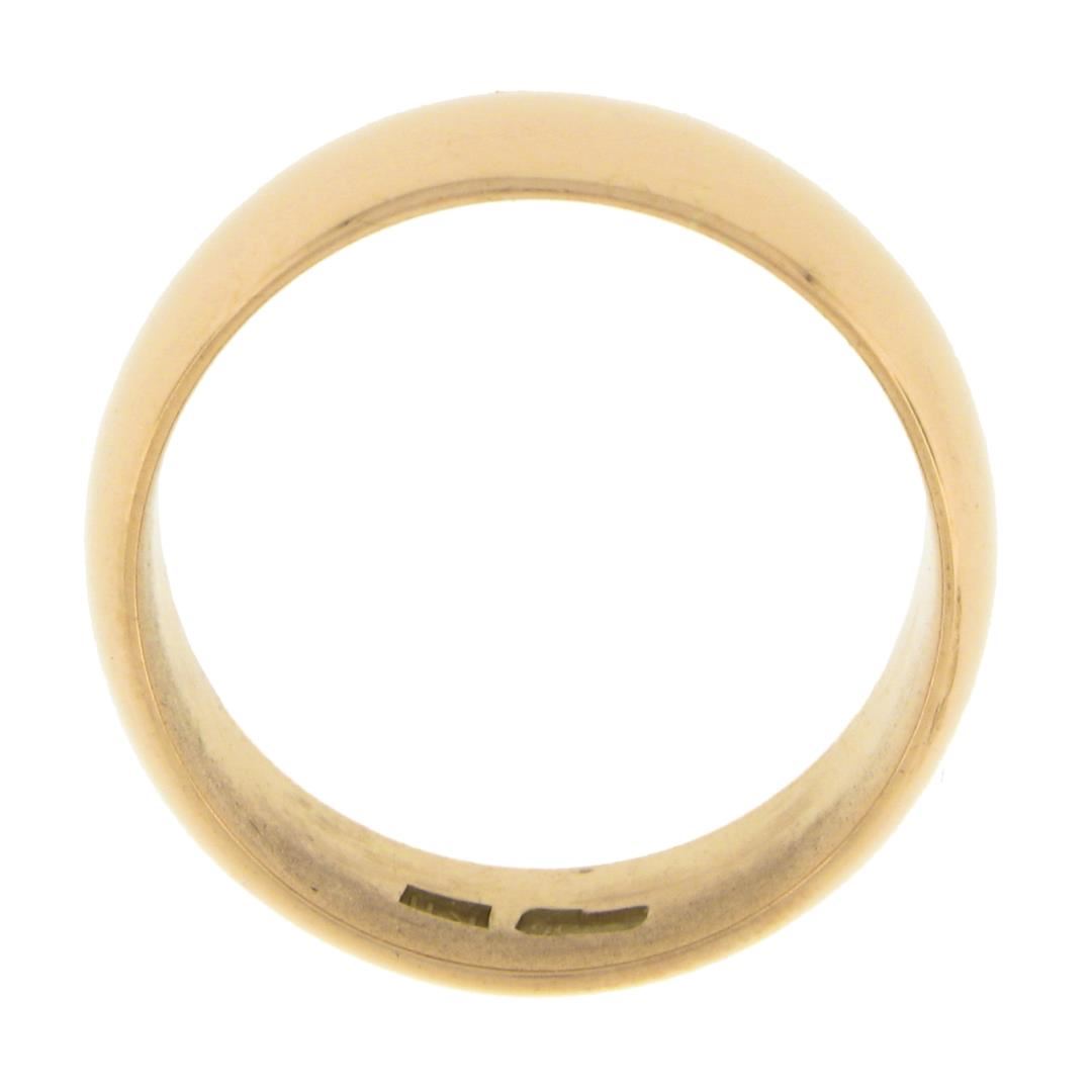 A solid 14k rosy yellow gold band ring. The ring is size 8.0, weighs a total of 7.93 grams, and measures 7.6mm wide.