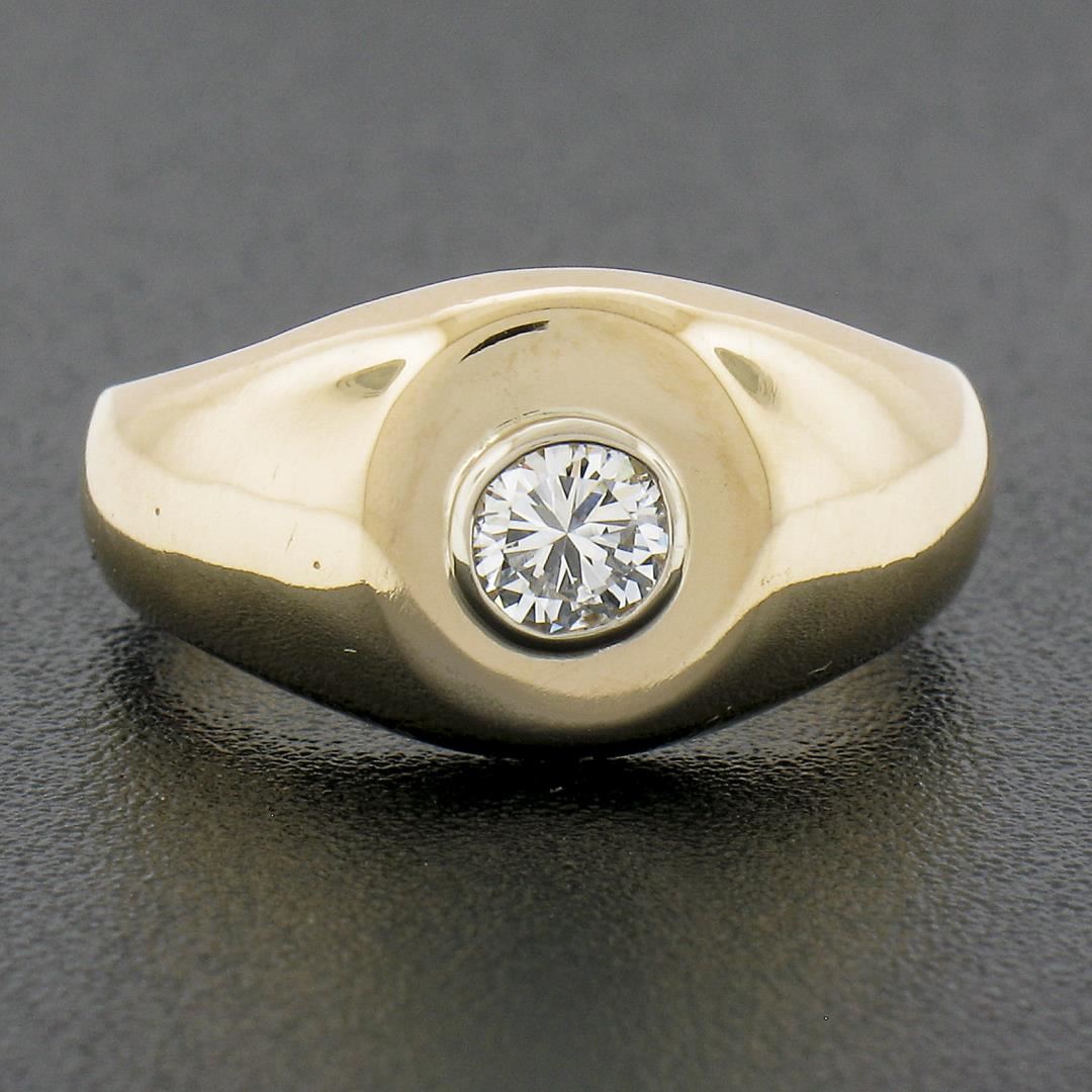 A solid 14k yellow gold signet band ring, with 1 round cut natural diamond (G - SI1 ; 0.21ct)The ring is size 3.75, weighs a total of 4.57 grams, and measures 9.3mm wide.