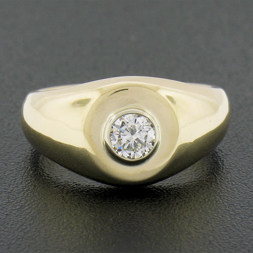 A solid 14k yellow gold signet ring, with1 round cut natural diamond (G - SI1 ; 0.25ct). The ring is size 4.0, weighs a total of 4.80 grams, and measures 9.3mm wide.