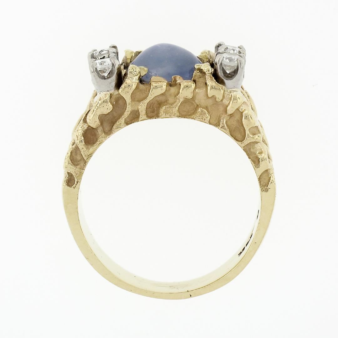 A vintage solid 14k yellow gold unisex ring, with 1 oval cabochon cut natural star sapphire (8.9x7.4mm), and 4 round cut natural diamonds (G/H - SI2/I1 ; 0.36ctw). The ring is size 9.0, weighs a total of 12.93 grams, and measures 10.8mm wide.