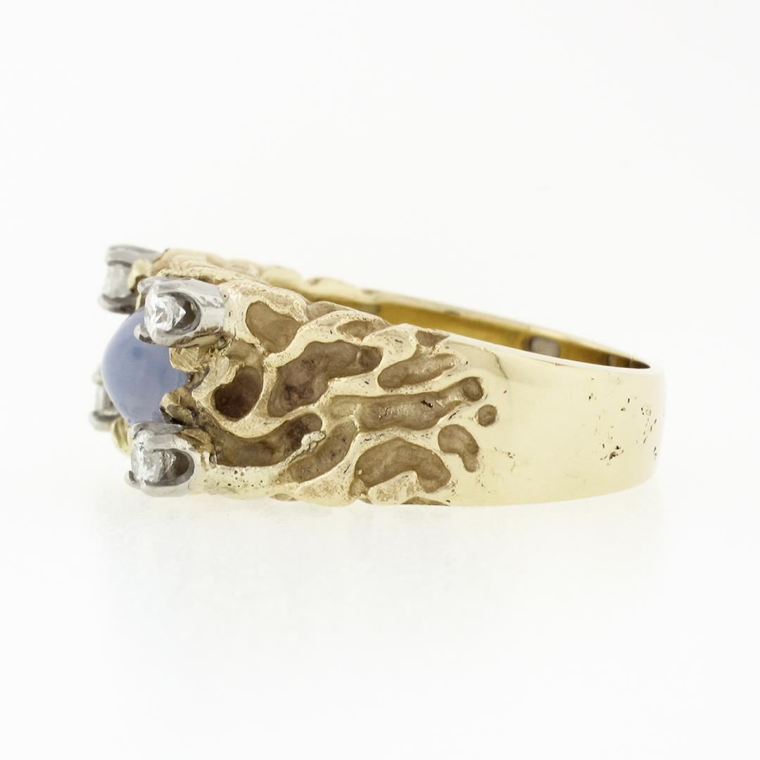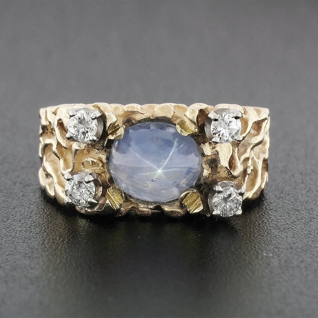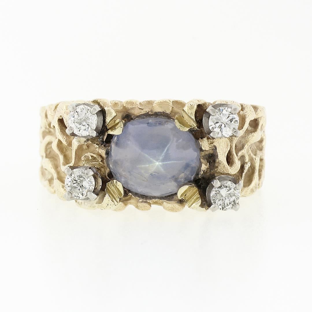 A vintage solid 14k yellow gold unisex ring, with 1 oval cabochon cut natural star sapphire (8.9x7.4mm), and 4 round cut natural diamonds (G/H - SI2/I1 ; 0.36ctw). The ring is size 9.0, weighs a total of 12.93 grams, and measures 10.8mm wide.