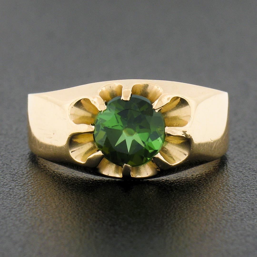 A vintage solid 14k yellow gold solitaire ring, with 1 round brilliant cut natural tourmaline (6.15mm / 0.85ct). The ring is size 5.5, weighs a total of 4.46 grams, and measures 8.7mm wide.