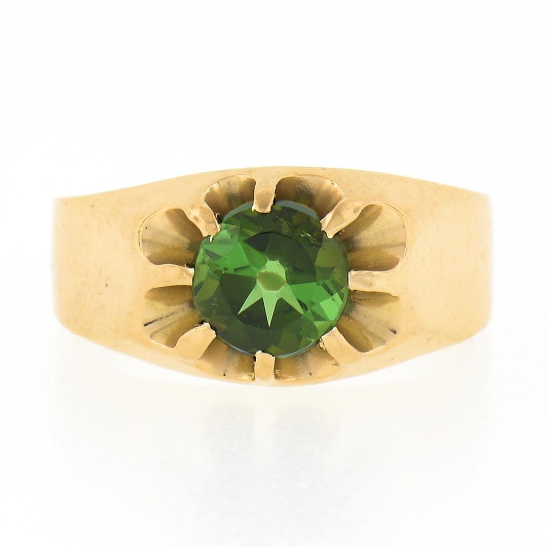 A vintage solid 14k yellow gold solitaire ring, with 1 round brilliant cut natural tourmaline (6.15mm / 0.85ct). The ring is size 5.5, weighs a total of 4.46 grams, and measures 8.7mm wide.