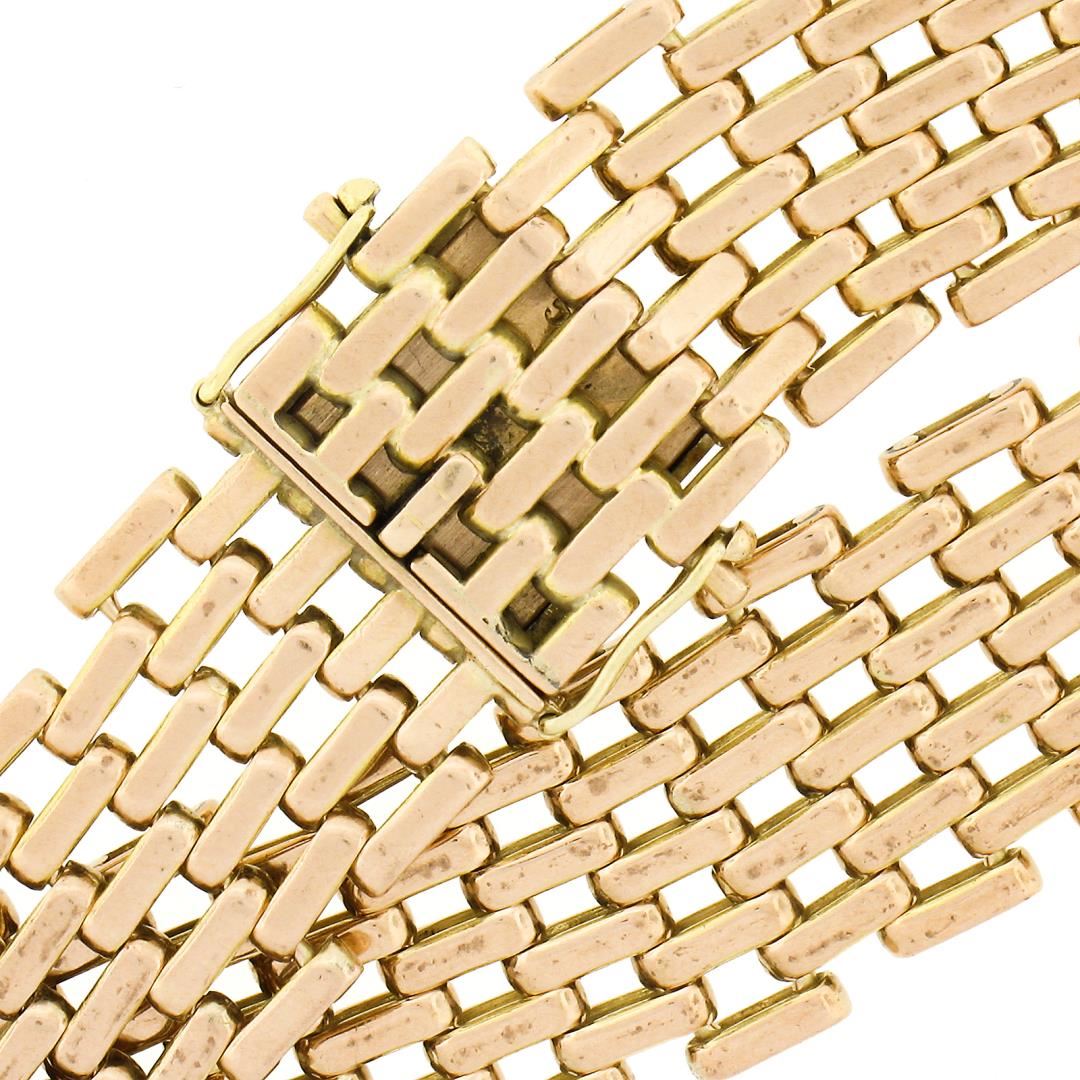 A vintage solid 14k yellow gold brick bracelet. It weighs a total of 40.12 grams, measures 14.80mm wide, and measures 7.75 inches in length.