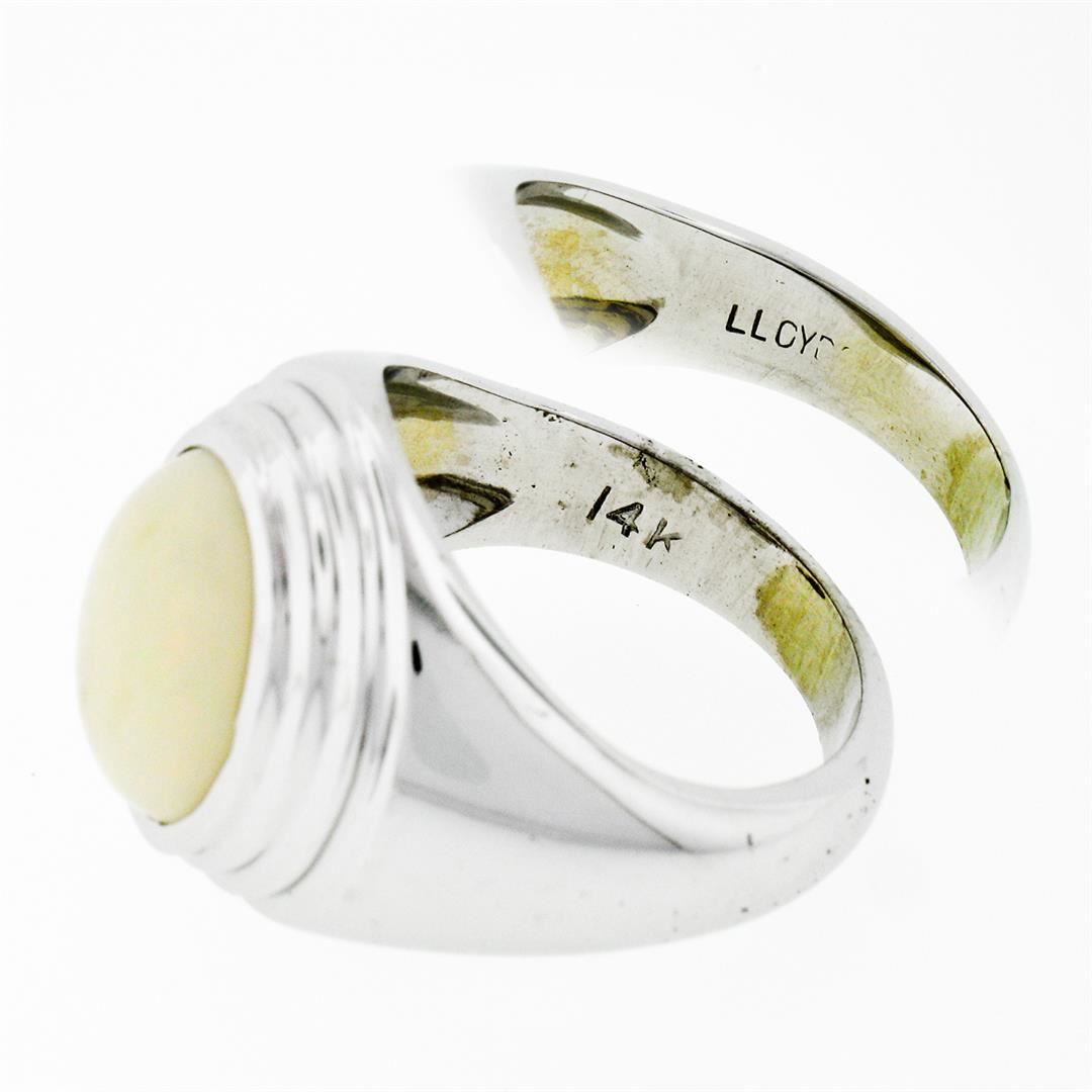 A vintage solid 14k white gold unisex solitaire ring, with 1 oval cabochon cut natural opal (11.75x10.0mm). The ring is size 6.5, weighs a total of 8.4 grams, and measures 16.85mm wide.