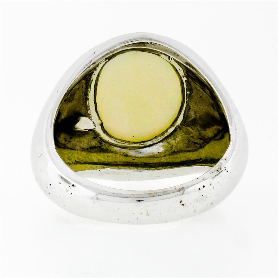A vintage solid 14k white gold unisex solitaire ring, with 1 oval cabochon cut natural opal (11.75x10.0mm). The ring is size 6.5, weighs a total of 8.4 grams, and measures 16.85mm wide.