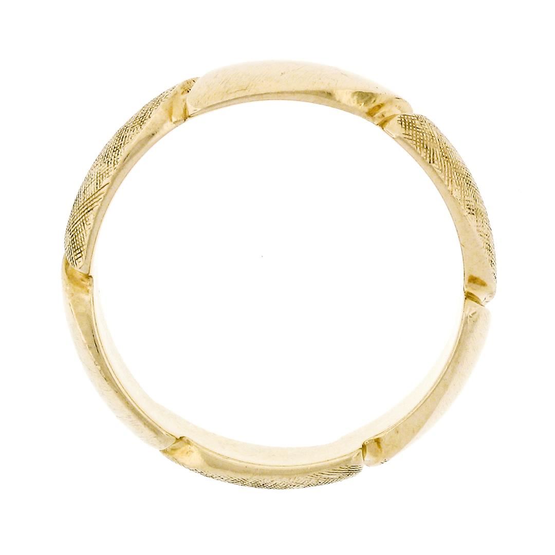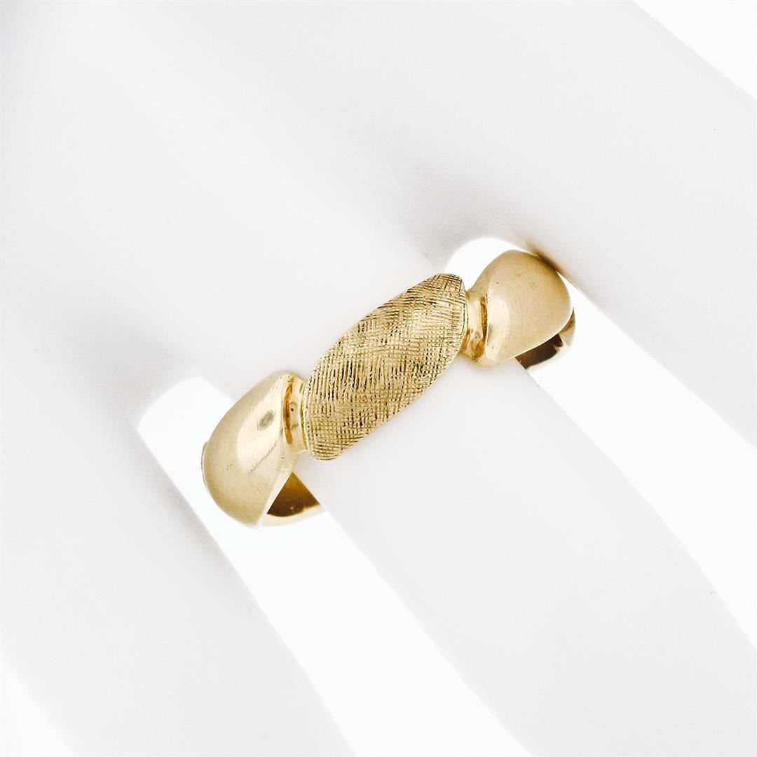 A vintage solid 14k yelliw gold grooved polished and florentine band ring. The ring is size 10, weighs a total of 6.30 grams, and measures 6.0mm wide.