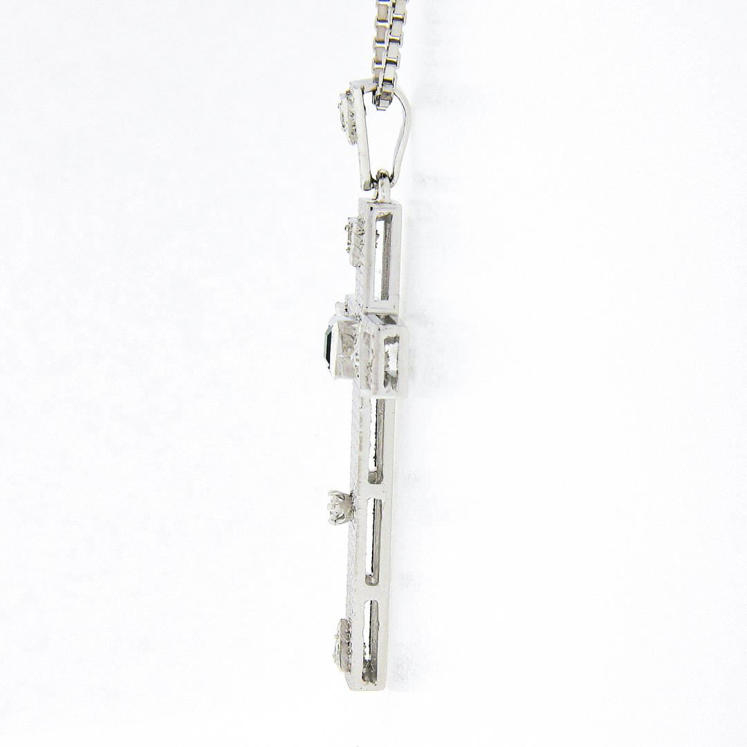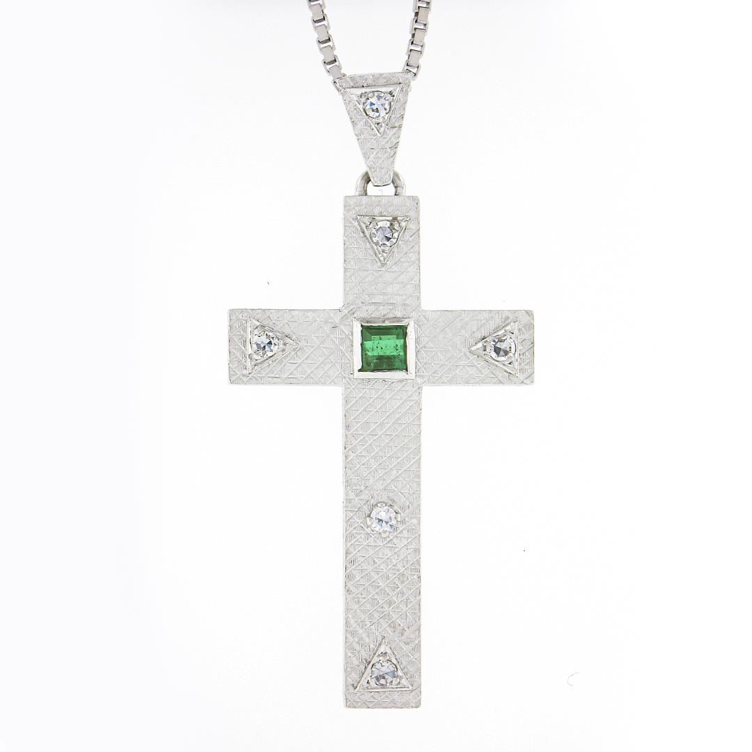 A vintage solid 18k white gold cross pendant necklace, with 1 square cut natural emerald (0.25ct), and 6 old single cut natural diamonds (H/I - SI1/SI2 ; 0.25ctw). 24 inch box link chain, 13.58 grams total weight, pendant measures 44.9x21.8mm.