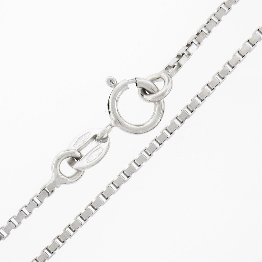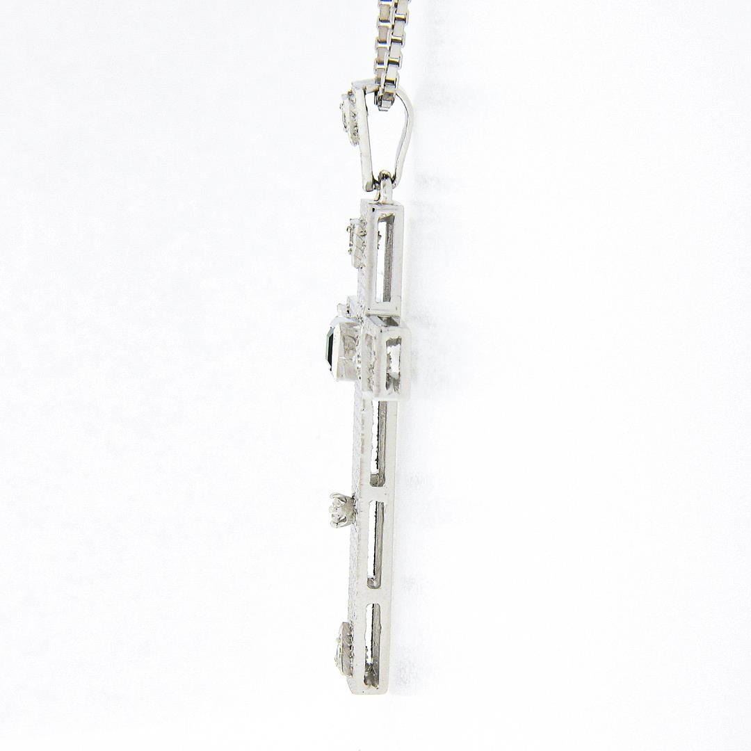 A vintage solid 18k white gold cross pendant necklace, with 1 square cut natural emerald (0.25ct), and 6 old single cut natural diamonds (H/I - SI1/SI2 ; 0.25ctw). 24 inch box link chain, 13.58 grams total weight, pendant measures 44.9x21.8mm.