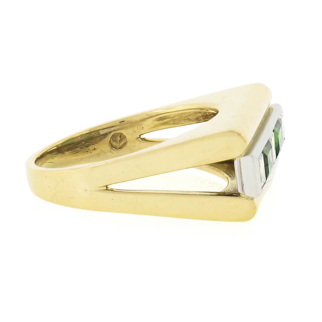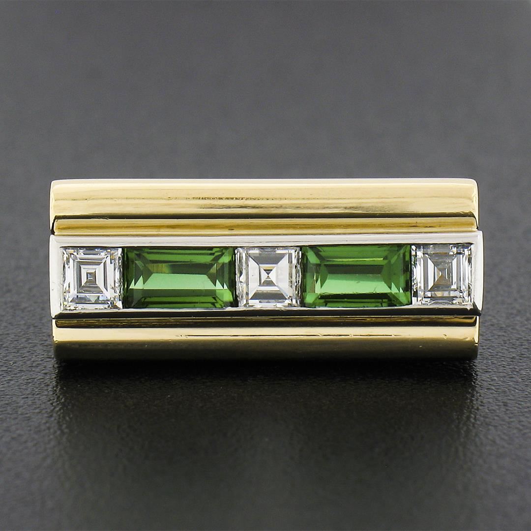 A vintage solid 18k yellow & white gold ring, with 2 baguette cut natural tourmalines ( 0.60ctw), and 3 square cut natural diamonds (F/G - VS1/VS2 ; 0.50ctw). The ring is size 6.0, weighs a total of 7.62 grams, and measures 8.3mm wide.