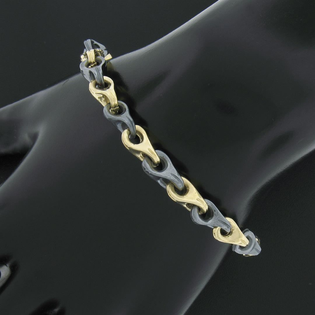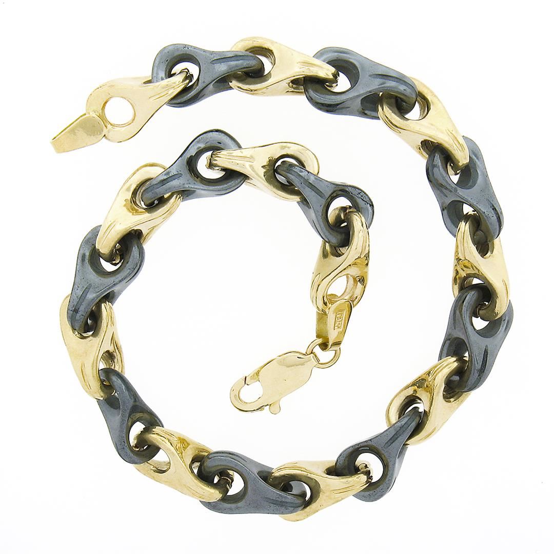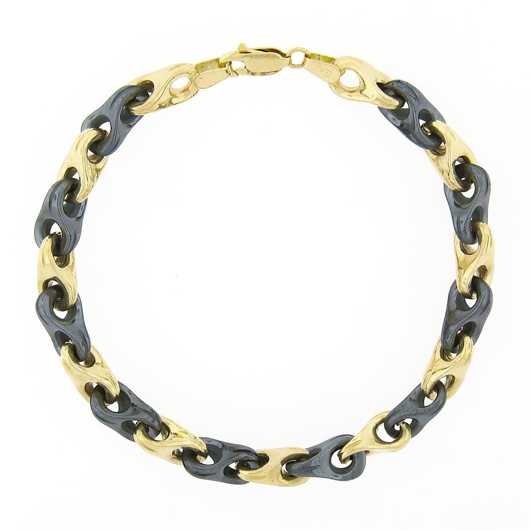 A vintage solid 14k yellow gold Italian bracelet. link is alternated with 10 pierced hemalite (11.5x6.55mm each). It weighs a total of 18.95 grams, measures 6.5mm wide, and measures 6.75 inches in length.