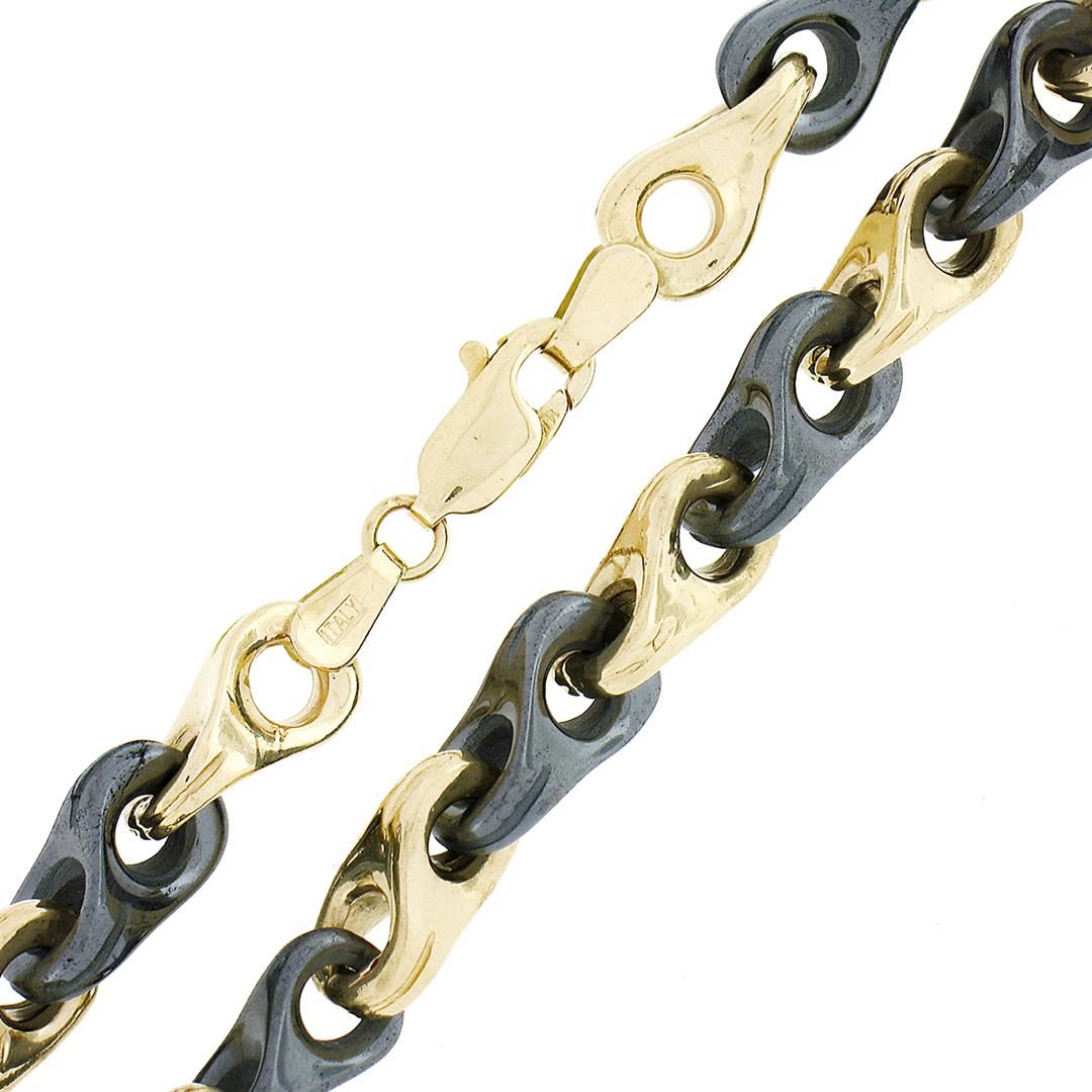 A vintage solid 14k yellow gold Italian bracelet. link is alternated with 10 pierced hemalite (11.5x6.55mm each). It weighs a total of 18.95 grams, measures 6.5mm wide, and measures 6.75 inches in length.