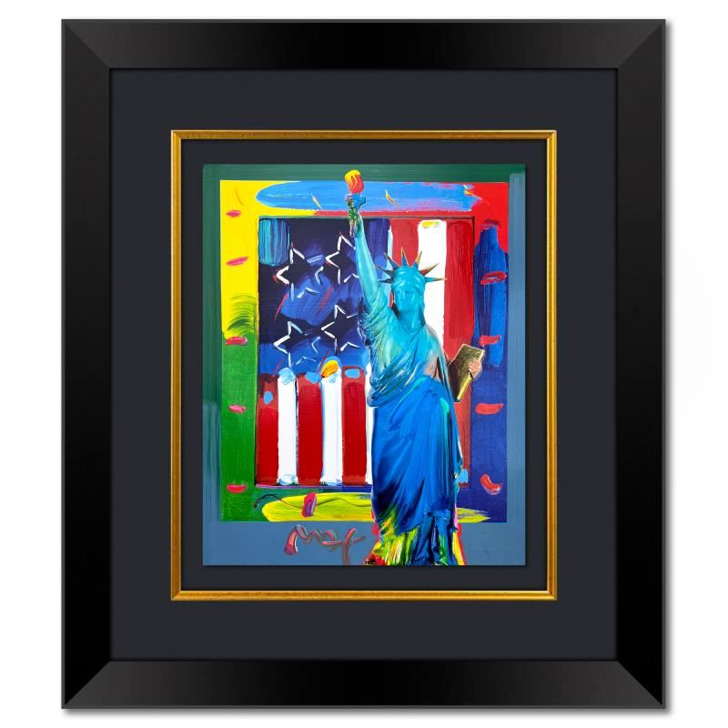 "United We Stand" is a one-of-a-kind mixed media on paper, hand signed by Peter Max. The piece comes custom framed with a backside cutout to display Peter Max Studio registration number 210899 certifying authenticity. Measures approximately 28" x 24" (frame), 19" x 15" (image).