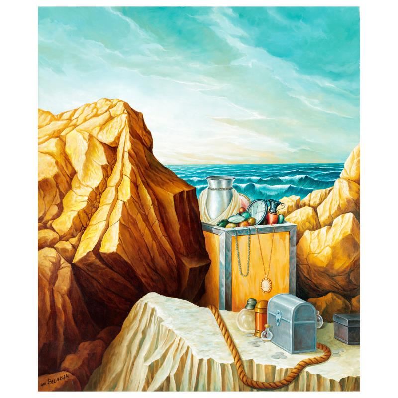 This is an original acrylic painting on stretched canvas by Avi Belaish, hand signed by the artist. Includes Letter of Authenticity. Measures approx. 40" x 48" (image). There is minor wear on the corners and edges that may be concealed when framed.