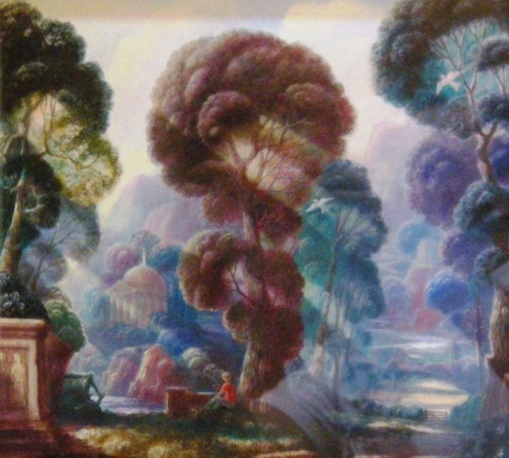 Untitled by Harold Hitchcock is a colorful scenery with tree and a man sitting surronded by them. This piece is a framed original watercolor with the size of 20" x 21".