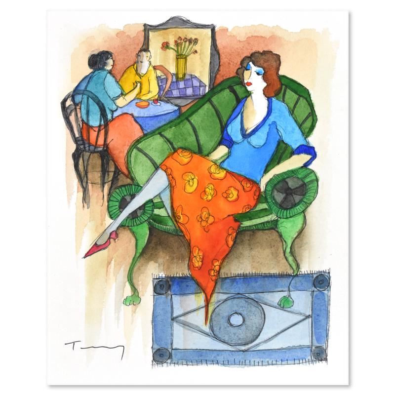 This is an original mixed media watercolor on paper by Itzchak Tarkay (1935-2012), hand signed by the artist. Includes Certificate of Authenticity. Measures approx. 8" x 10" (image).