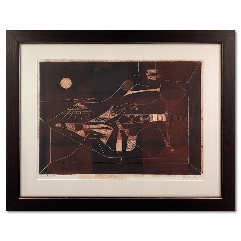 This is a one-of-a-kind linocut on paper by Neal Doty (1941-2016), dated 1985, numbered 1/1 and hand signed by the artist. This piece comes custom framed. Includes Letter of Authenticity. Measures approx. 30.5" x 25" (frame), 21" x 16" (image).