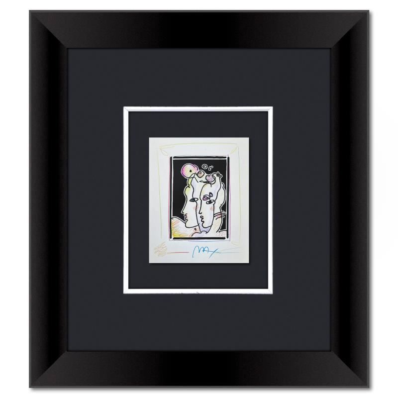 This is a one-of-a-kind mixed media on paper, hand signed by Peter Max. The piece comes custom framed with a backside cutout to display Peter Max Studio registration number 338298 certifying authenticity. Measures approximately 23 x 21 (frame), 9 x 7 (image).