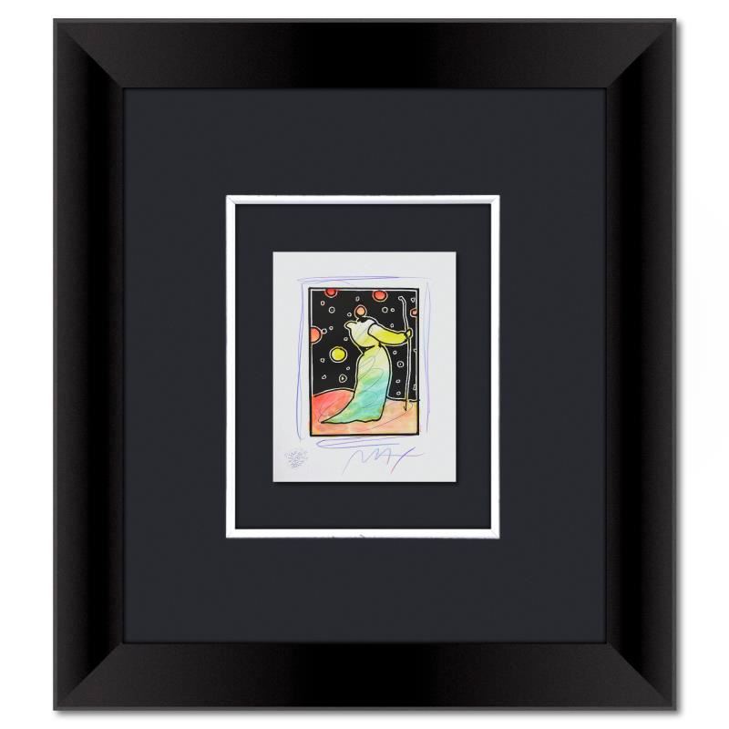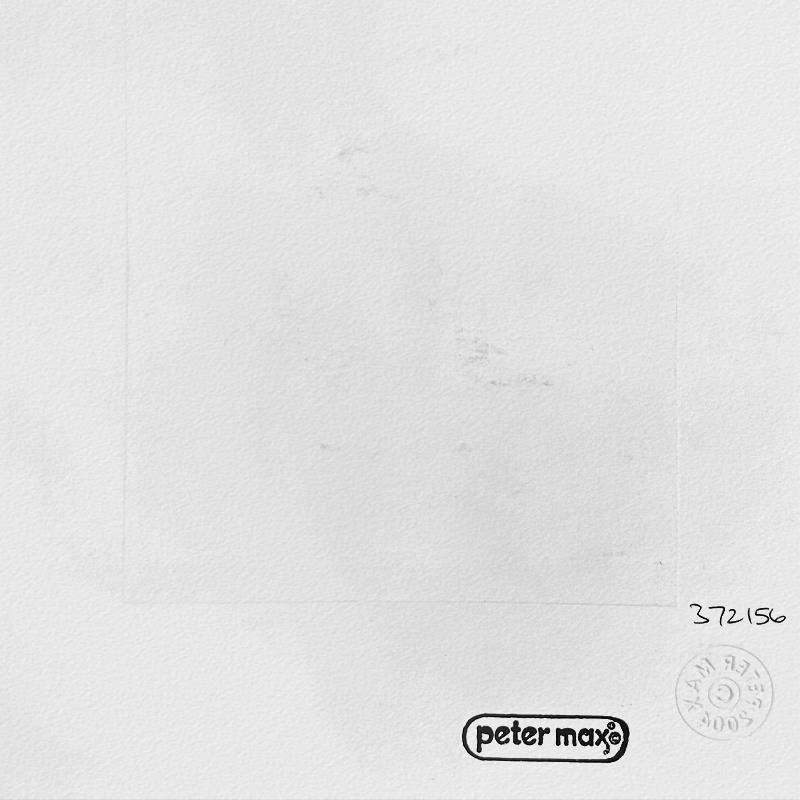 This is a one-of-a-kind mixed media on paper, hand signed by Peter Max. The piece comes custom framed with a backside cutout to display Peter Max Studio registration number 372156 certifying authenticity. Measures approximately 23 x 21 (frame), 9 x 7 (image).