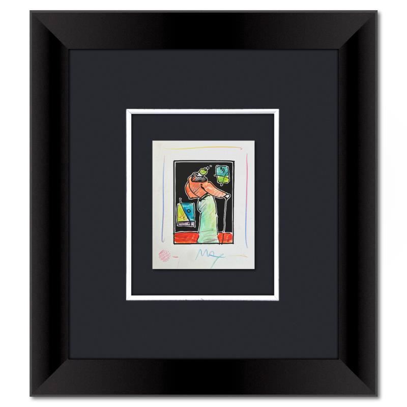 This is a one-of-a-kind mixed media on paper, hand signed by Peter Max. The piece comes custom framed with a backside cutout to display Peter Max Studio registration number 339834 certifying authenticity. Measures approximately 23 x 21 (frame), 9 x 7 (image).
