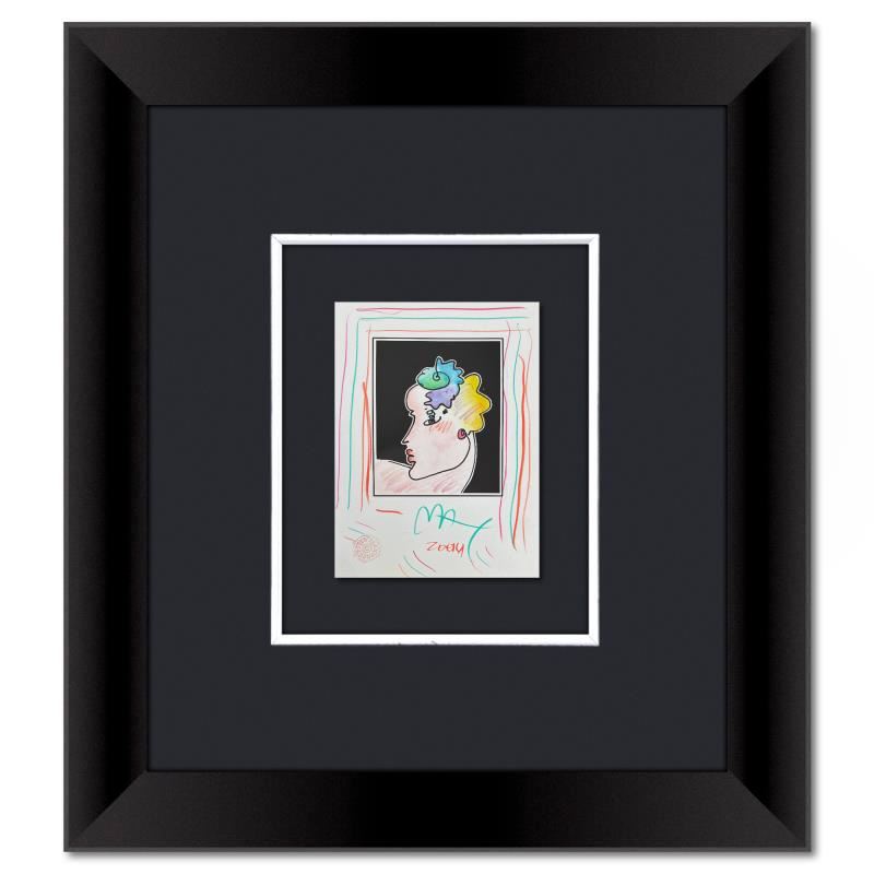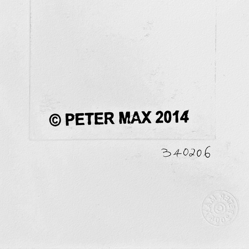 This is a one-of-a-kind mixed media on paper, hand signed by Peter Max. The piece comes custom framed with a backside cutout to display Peter Max Studio registration number 340206 certifying authenticity. Measures approximately 22.5 x 20 (frame), 8.5 x 6 (image).