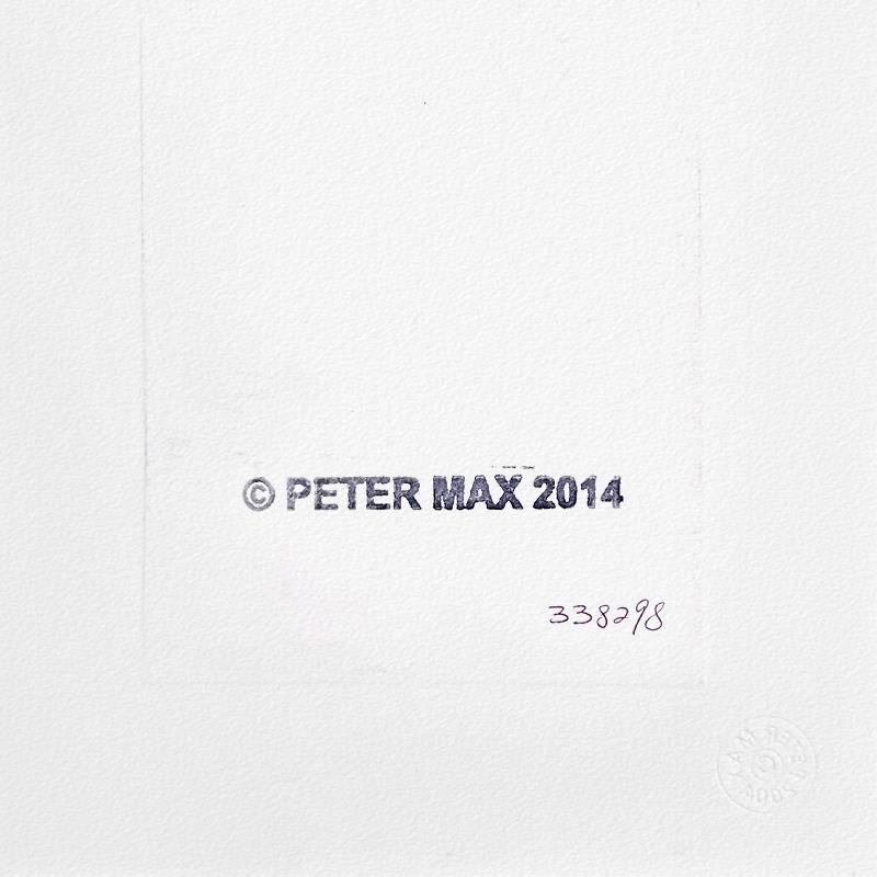 This is a one-of-a-kind mixed media on paper, hand signed by Peter Max. The piece comes custom framed with a backside cutout to display Peter Max Studio registration number 338298 certifying authenticity. Measures approximately 23 x 21 (frame), 9 x 7 (image).