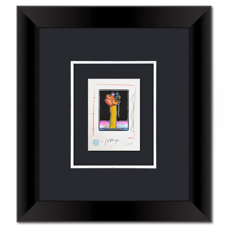 This is a one-of-a-kind mixed media on paper, hand signed by Peter Max. The piece comes custom framed with a backside cutout to display Peter Max Studio registration number 340374 certifying authenticity. Measures approximately 22.5 x 20 (frame), 8.5 x 6 (image).