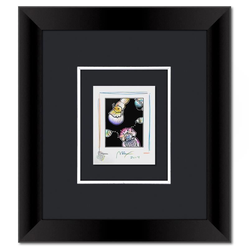 This is a one-of-a-kind mixed media on paper, hand signed by Peter Max. The piece comes custom framed with a backside cutout to display Peter Max Studio registration number 340511 certifying authenticity. Measures approximately 23" x 21" (frame), 9" x 7" (image).