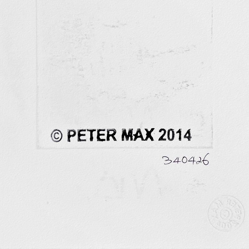 This is a one-of-a-kind mixed media on paper, hand signed by Peter Max. The piece comes custom framed with a backside cutout to display Peter Max Studio registration number 340426 certifying authenticity. Measures approximately 22.5" x 20" (frame), 8.5" x 6" (image).