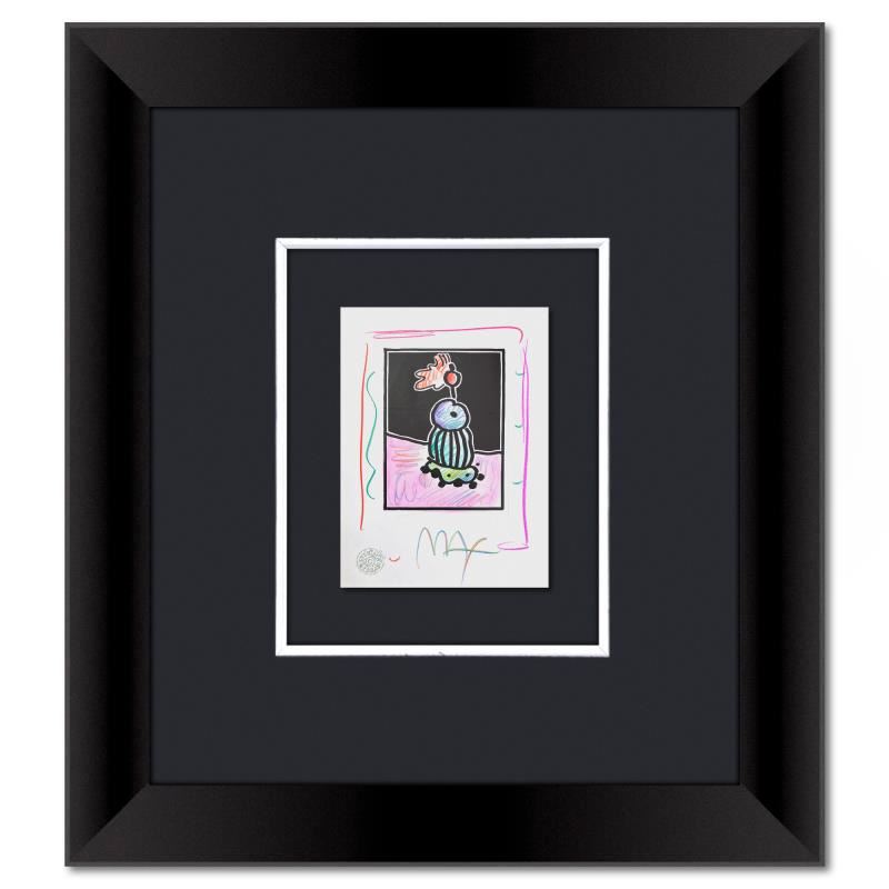 This is a one-of-a-kind mixed media on paper, hand signed by Peter Max. The piece comes custom framed with a backside cutout to display Peter Max Studio registration number 340426 certifying authenticity. Measures approximately 22.5" x 20" (frame), 8.5" x 6" (image). This item requires special handling and may have a longer than usual turnaround.