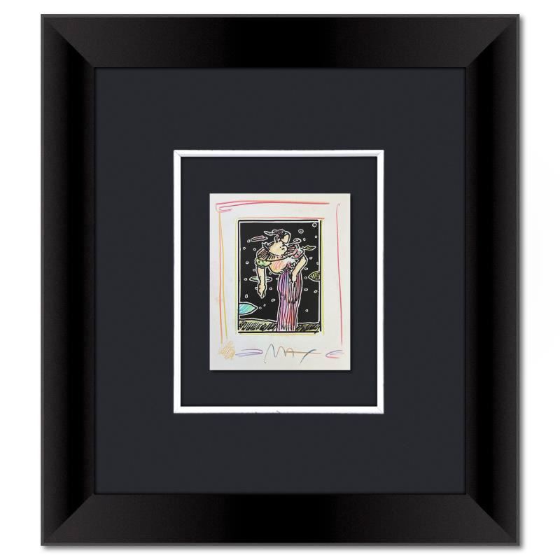 This is a one-of-a-kind mixed media on paper, hand signed by Peter Max. The piece comes custom framed with a backside cutout to display Peter Max Studio registration number 340454 certifying authenticity. Measures approximately 23 x 21 (frame), 9 x 7 (image).