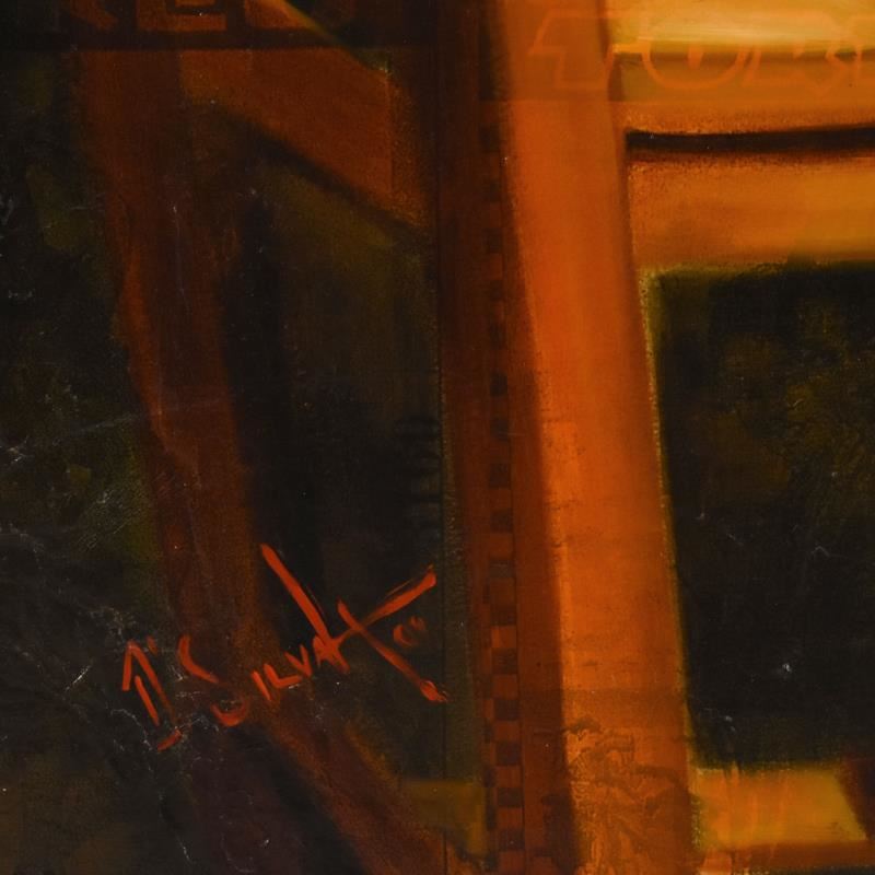 This is an original painting on gallery wrapped canvas by David Silva, hand signed by the artist. The artist uses a technique in which he fuses a base layer of paper on top of the canvas before applying oil paint. Includes Letter of Authenticity. Measures approx. 30" x 50" (image). ** Please note: there is a small puncture mark on the bottom-right part on the image, as well as wear on the corners and edges. **