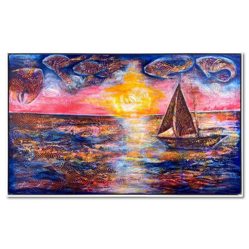 This is an original acrylic painting on canvas by Nadia Volna, hand signed by the artist. This piece is painted with light-reactive black light paint that reveals brilliant colors when viewed under incandescent light. This piece comes with a blacklight flashlight (batteries not included). This piece comes custom framed. Includes Letter of Authenticity. Measures approx. 61.5" x 37.5" (frame), 60" x 36" (image).