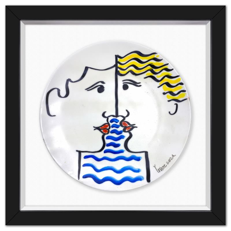 This is a hand painted ceramic plate by Yuroz, hand signed by the artist. This piece comes custom framed floated on linen. Includes Letter of Authenticity. Measures approx. 15.5" x 16" (frame), 11" (diameter).