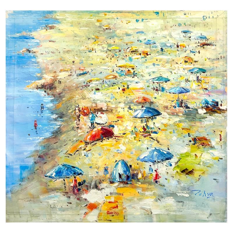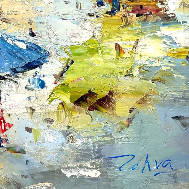 This is an original acrylic painting on canvas by Zahra, hand signed by the artist. Includes Letter of Authenticity. Measures approx. 44" x 44" (image). There are minor creases and cracks in the border area that will be concealed when stretched and framed.